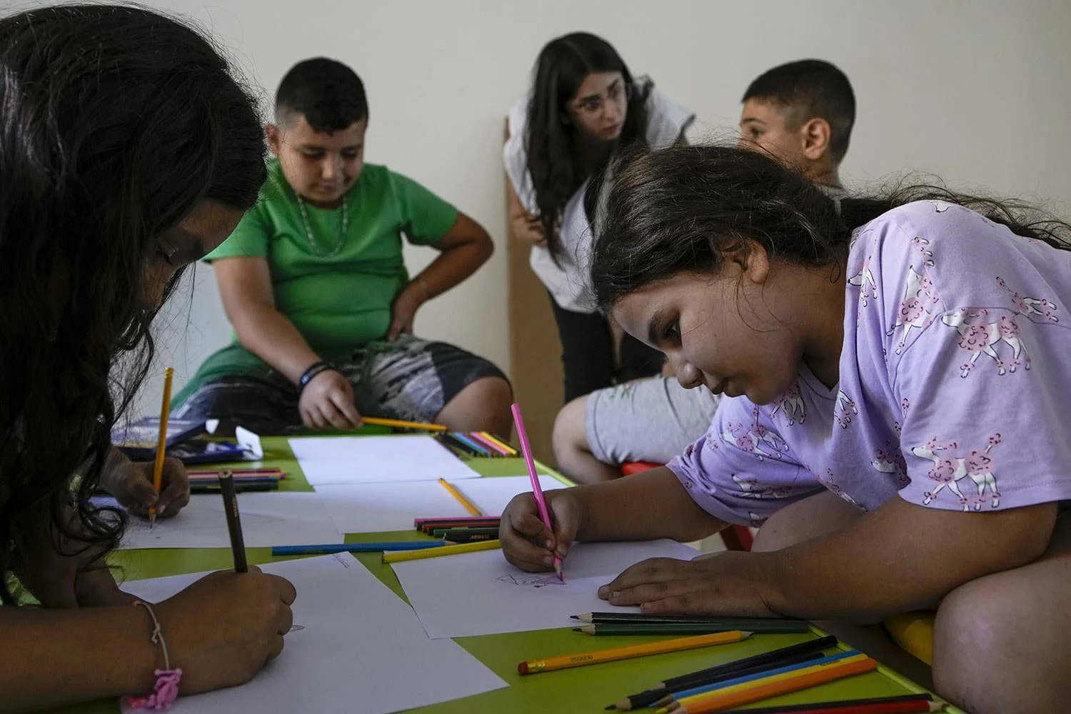 Displaced children draw during a mental healthcare session organized by Doctors Without Borders in an empty building complex housing them, in Beirut, Lebanon, Wednesday, Oct. 9, 2024. (AP Photo/Bilal Hussein)