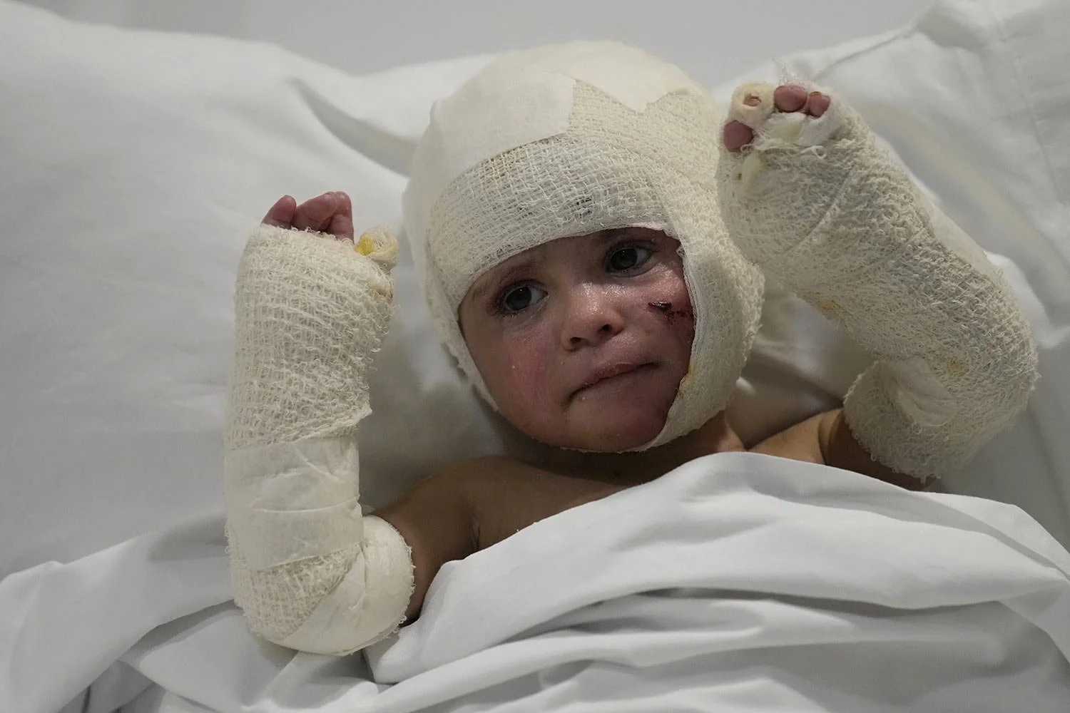 Ivana Skakye, 2, a Lebanese child who is suffering from third-degree burns over 40 percent of her body following an Israeli airstrike last September near their home in Deir Qanoun al Nahr, a village in south Lebanon, raises her burned arms as she lies on a bed at the Geitaoui hospital where she is receiving treatment, in Beirut, Lebanon, Tuesday, Oct. 29, 2024. (AP Photo/Hussein Malla)