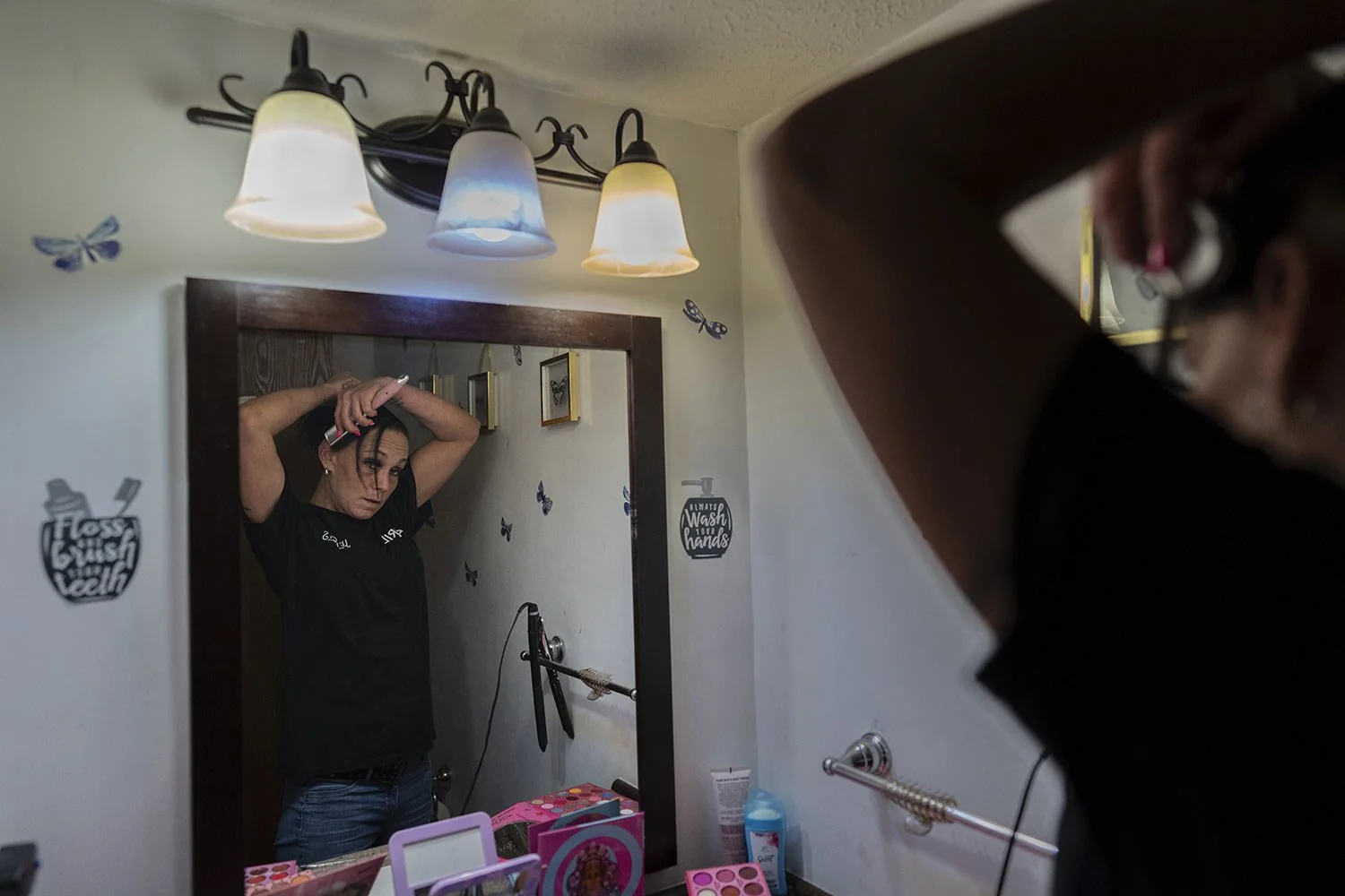 April Youst puts her hair up as she gets ready for work in her West Virginia home on Wednesday, Oct. 9, 2024. (AP Photo/Carolyn Kaster)