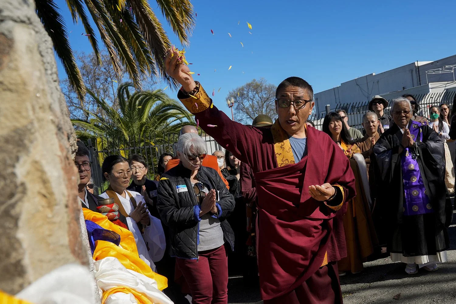 Khenpo Paljor, a Tibetan lama from Des Moines, Iowa, leads a prayer at the Birthplace of Antioch marker, Saturday, March 16, 2024, in Antioch, Calif. Participants of the event titled “May We Gather” placed traditional Tibetan scarves on the marker as they prayed for peace and harmony. (AP Photo/Godofredo A. Vasquez)