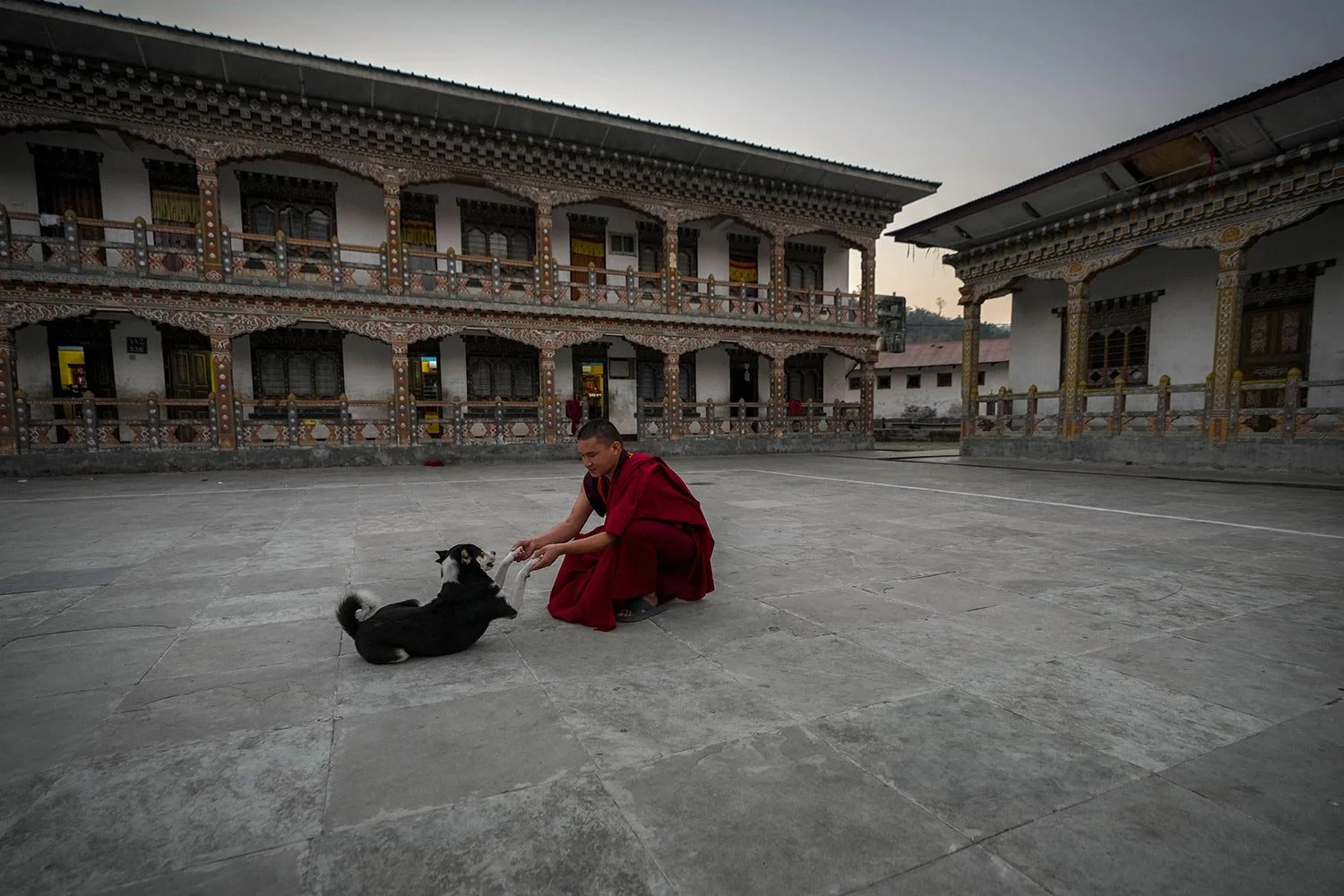 A monk plays with a dog outside a monastery in Samdrup Jongkhar, Bhutan, Sunday, Jan. 7, 2024. (AP Photo/Anupam Nath)