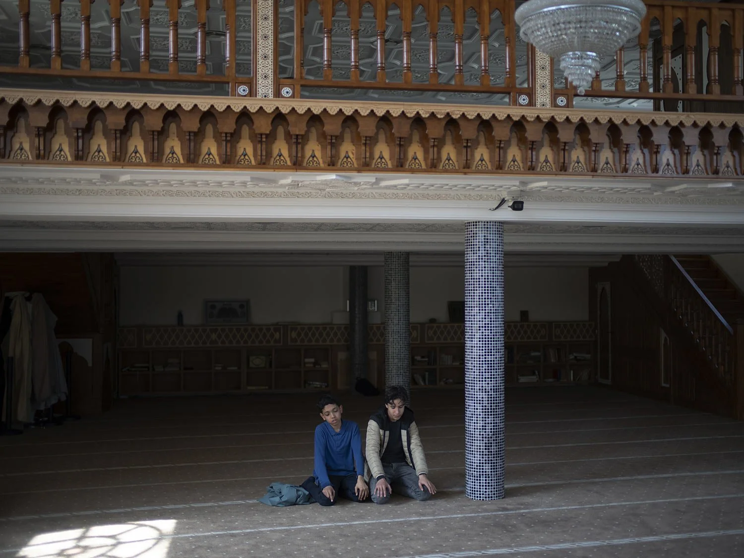 Students pray during recess in the mosque at Ibn Khaldoun, a private Muslim school, in Marseille, southern France, Tuesday, April 16, 2024. (AP Photo/Daniel Cole)