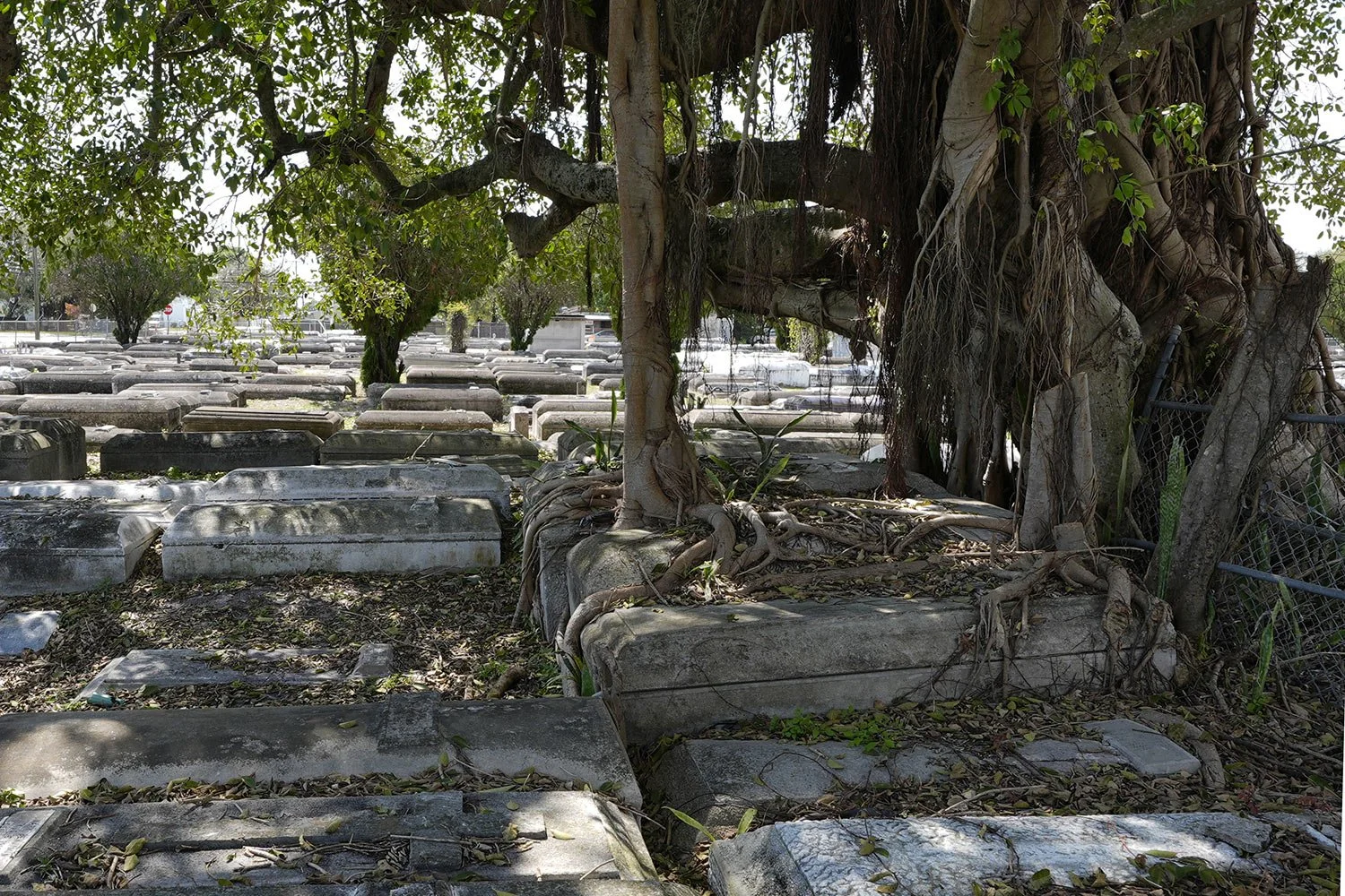 Above ground graves are placed next to each other under the shade of a banyan tree at the Lincoln Memorial Park Cemetery, Monday, Feb. 26, 2024, in the Brownsville neighborhood of Miami. The cemetery holds the remains of 10,000 Black Americans, including some of Miami’s most influential figures including Miami’s first Black millionaire, D.A. Dorsey, and Gwen Cherry, Florida’s first Black woman to serve in Florida’s legislature. (AP Photo/Marta Lavandier)