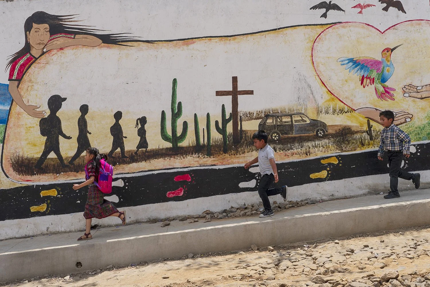 Children run past a mural memorializing 19 locals who were shot and burned in Camargo, Mexico, as they attempted to migrate to the U.S., in Comitancillo, Guatemala, Tuesday, March 19, 2024. (AP Photo/Moises Castillo)
