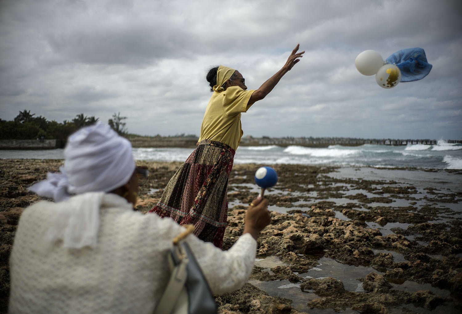 In Havana, Gloria Esperanza Reyes makes her monthly offering to Yemaya, the Yoruba goddess of the sea, by tossing flowers and sugarcane syrup into the waves.