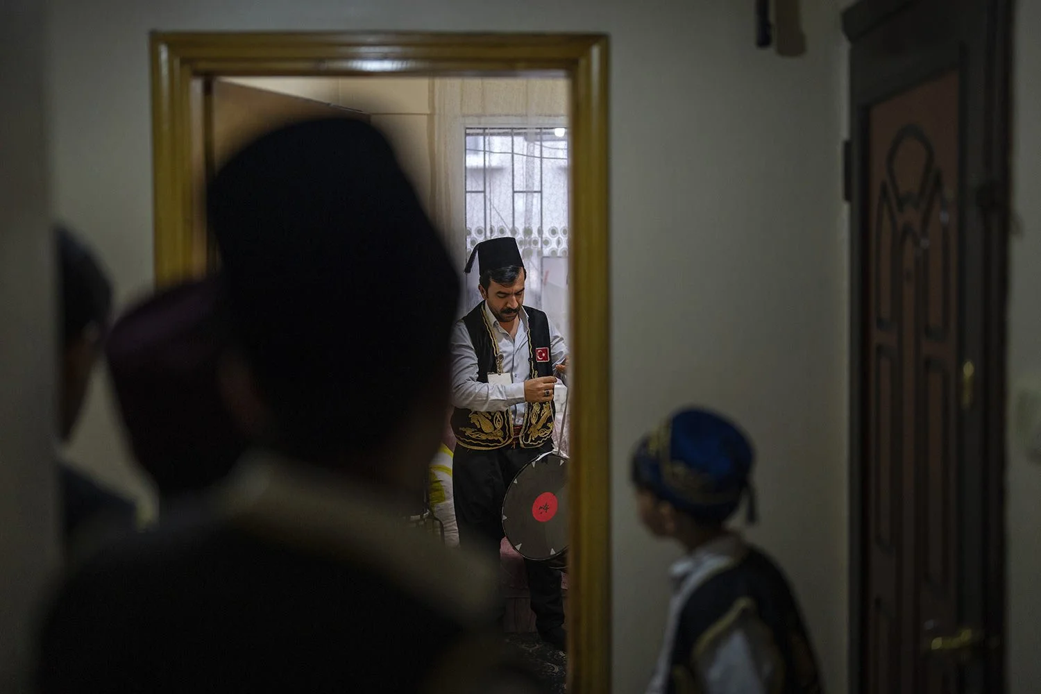 “Ramazan davulcusu” or Ramadan drummer Muzaffer Kara gets dressed with a traditional attire at his house, in Istanbul, Thursday, March 28, 2024. From the Ottoman era, drummers dressed up with traditional attire play drums in their neighbourhoods at early morning hours to wake up people for “suhoor” or pre-dawn meal during the Muslim holy fasting month of Ramadan. (AP Photo/Francisco Seco)