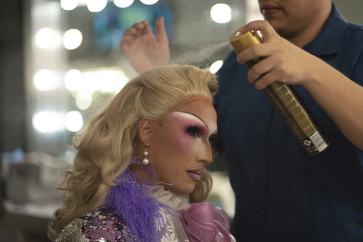 As he says it, his makeup artist helps him pull on a bright blonde wig, and Barraza shrugs on a purple sequined blazer. Each piece goes on like another layer of sparkle-studded armor until all that remains of Barraza is a playful smile under purple lipstick.