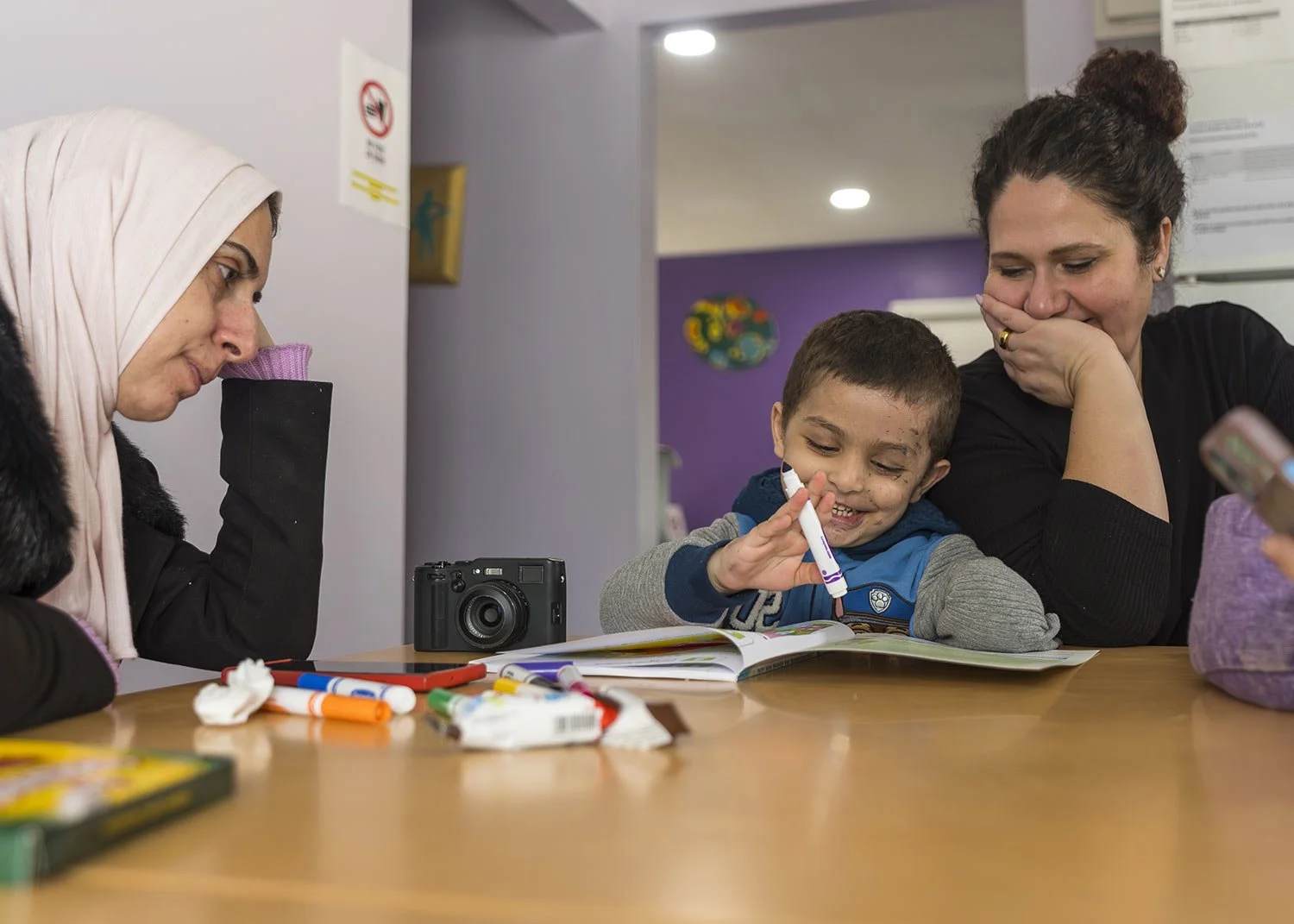 Four-year-old Omar Abu Kuwaik, center, works on activities in a math workbook with clinical social worker Sandy Lulu, right, as his aunt Maha Abu Kuwaik looks on, at the Global Medical Relief Fund residence, Sunday, Feb. 11, 2024, in the Staten Island borough of New York. Omar Abu Kuwaik is far from his home in Gaza. (AP Photo/Peter K. Afriyie)