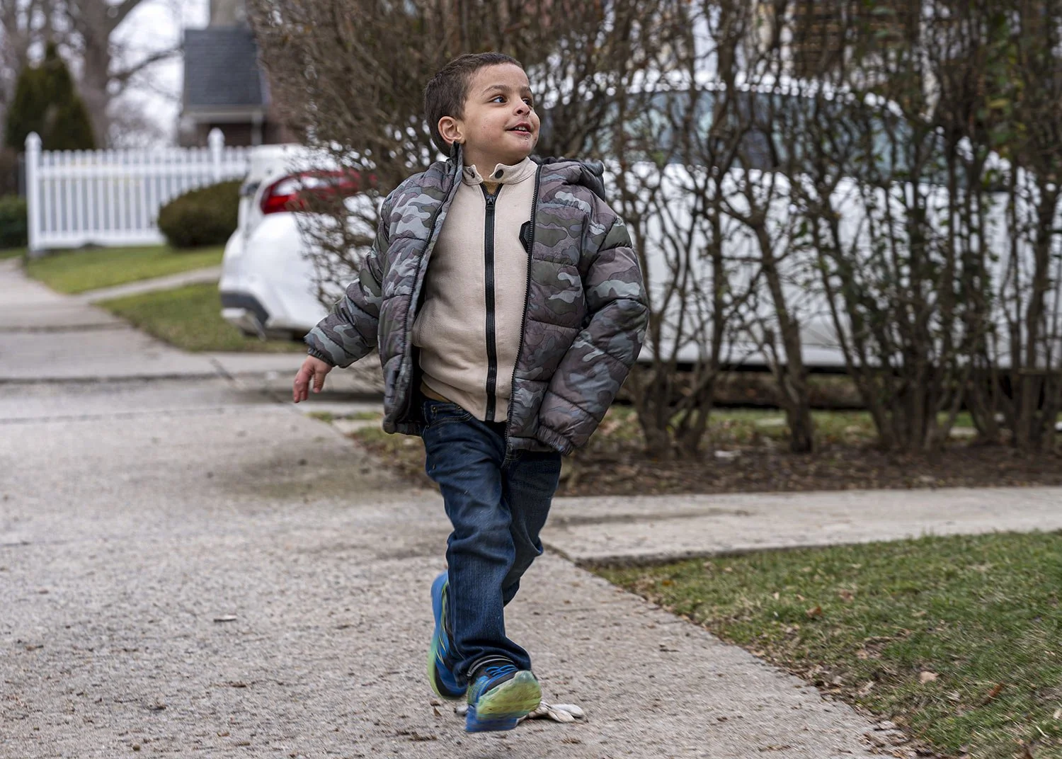 Four-year-old Omar Abu Kuwaik strolls down the sidewalk near the Global Medical Relief Fund residence, Tuesday, Jan. 30, 2024, in the Staten Island borough of New York. Omar Abu Kuwaik is far from his home in Gaza. (AP Photo/Peter K. Afriyie)