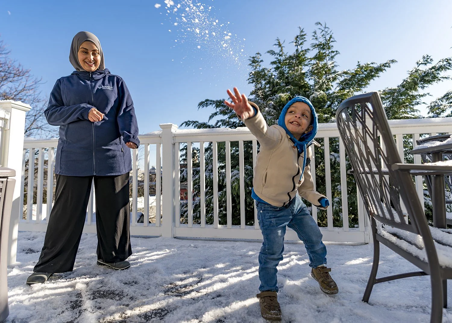Omar Abu Kuwaik throws snow shortly after arriving from Gaza at the residence of the Global Medical Relief Fund as Khaolah Obahi of Rahma Worldwide looks on, Wednesday, Jan. 17, 2024, in the Staten Island borough of New York. The snow was the first that the 4-year-old had ever experienced. (AP Photo/Peter K. Afriyie)
