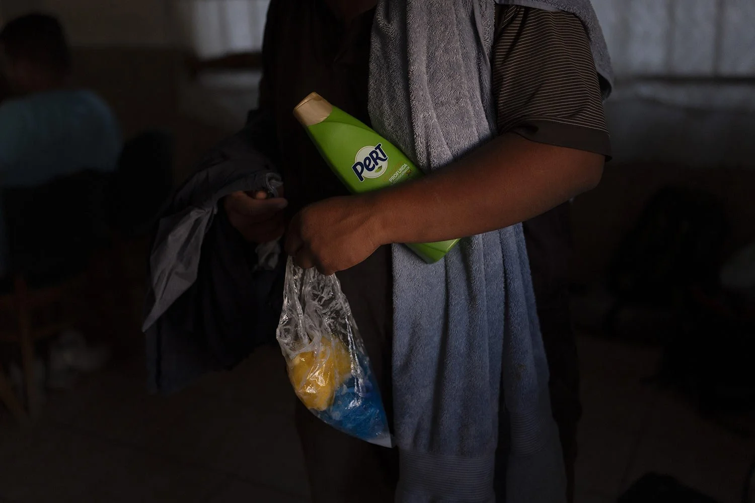 A migrant recently deported from the U.S. waits in line to shower at the San Juan Bosco migrant shelter in Nogales, Mexico, Tuesday, June 25, 2024. (AP Photo/Jae C. Hong)