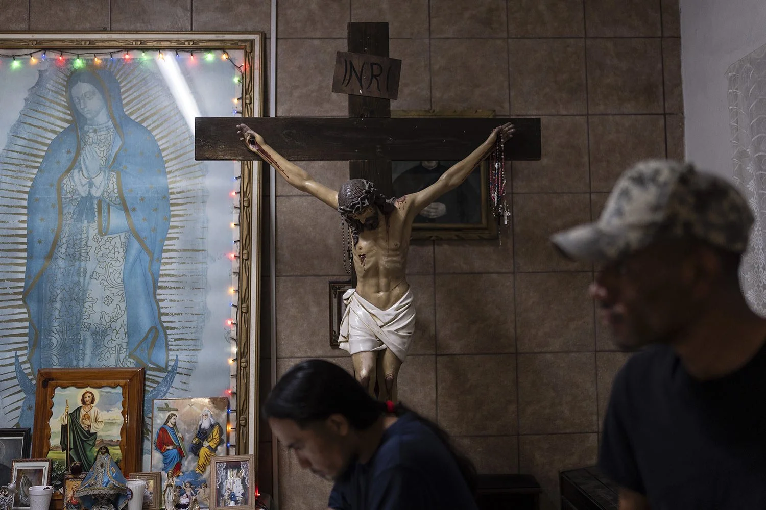 Two migrants wait for dinner in a chapel at the San Juan Bosco migrant shelter in Nogales, Mexico, Tuesday, June 25, 2024. (AP Photo/Jae C. Hong)