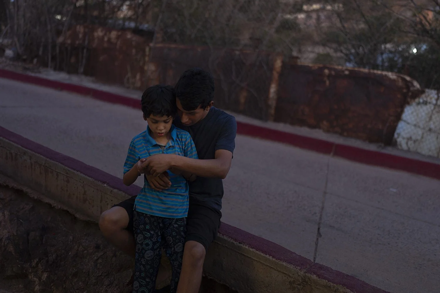 Luis Reynosa, right, a 17-year-old Mexican migrant recently deported back to his homeland, watches a video with a young boy outside the San Juan Bosco migrant shelter in Nogales, Mexico, Tuesday, June 25, 2024. (AP Photo/Jae C. Hong)