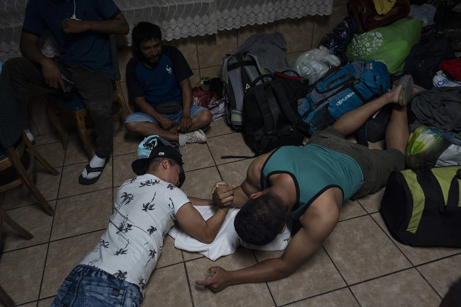 Yazmani Gomes, left, arm-wrestles with Eliseo Lopez while waiting for dinner at San Juan Bosco migrant shelter in Nogales, Mexico, Tuesday, June 25, 2024. (AP Photo/Jae C. Hong)