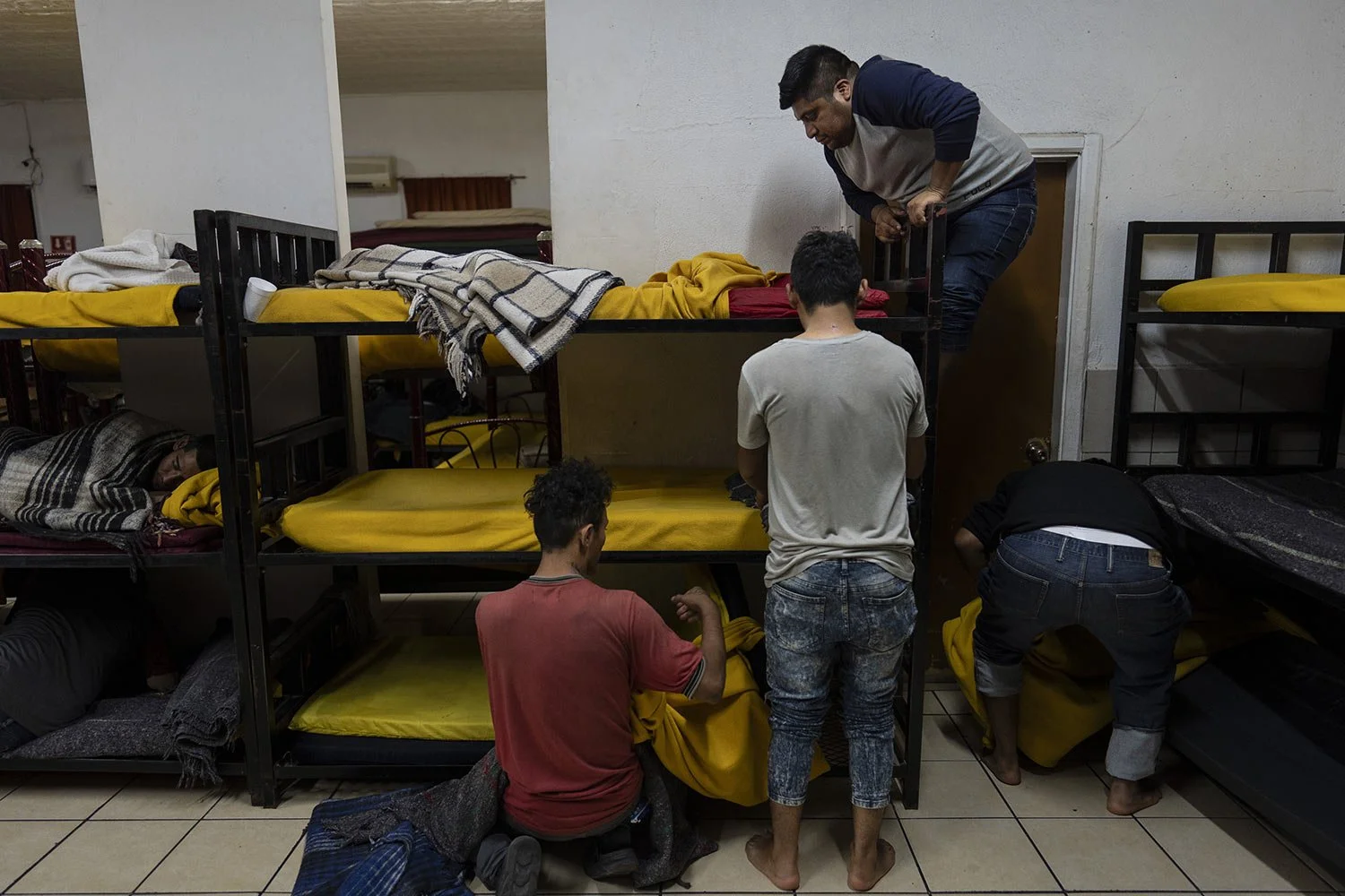 Migrants, mostly Mexican nationals recently deported from the U.S., prepare to settle into their bunk beds for the night at the San Juan Bosco migrant shelter in Nogales, Mexico, Tuesday, June 25, 2024. (AP Photo/Jae C. Hong)