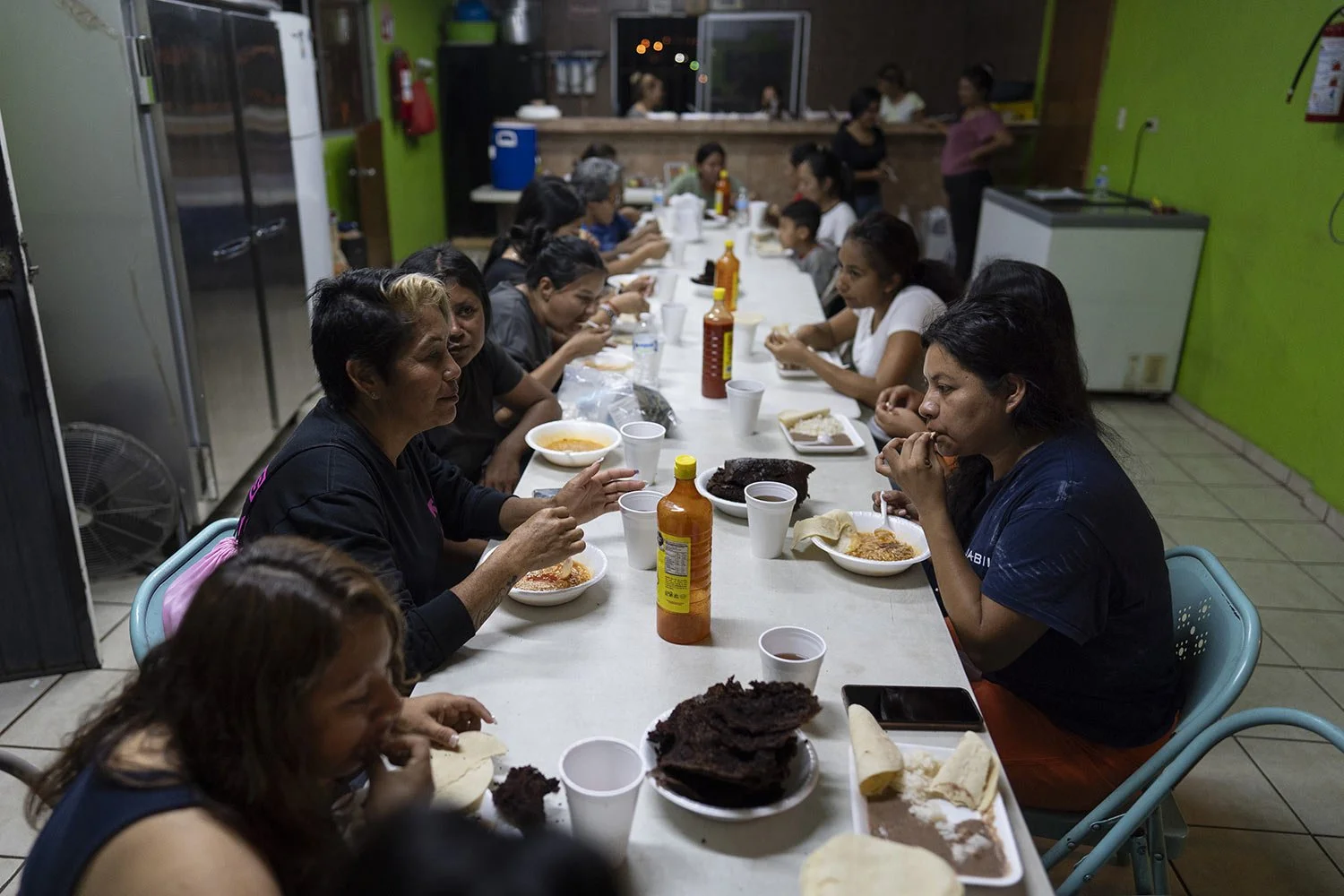 Migrants, mostly Mexican nationals recently deported from the U.S., eat their dinner at the San Juan Bosco migrant shelter in Nogales, Mexico, Tuesday, June 25, 2024. (AP Photo/Jae C. Hong)
