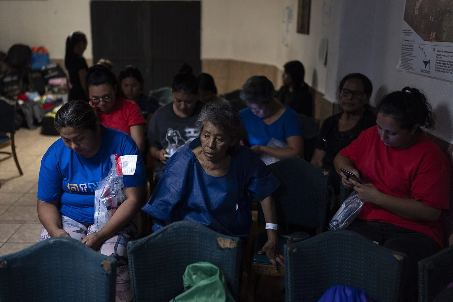 Female migrants who were recently deported from the U.S. sit in a chapel at the San Juan Bosco migrant shelter while waiting for dinner in Nogales, Mexico, Tuesday, June 25, 2024. (AP Photo/Jae C. Hong)