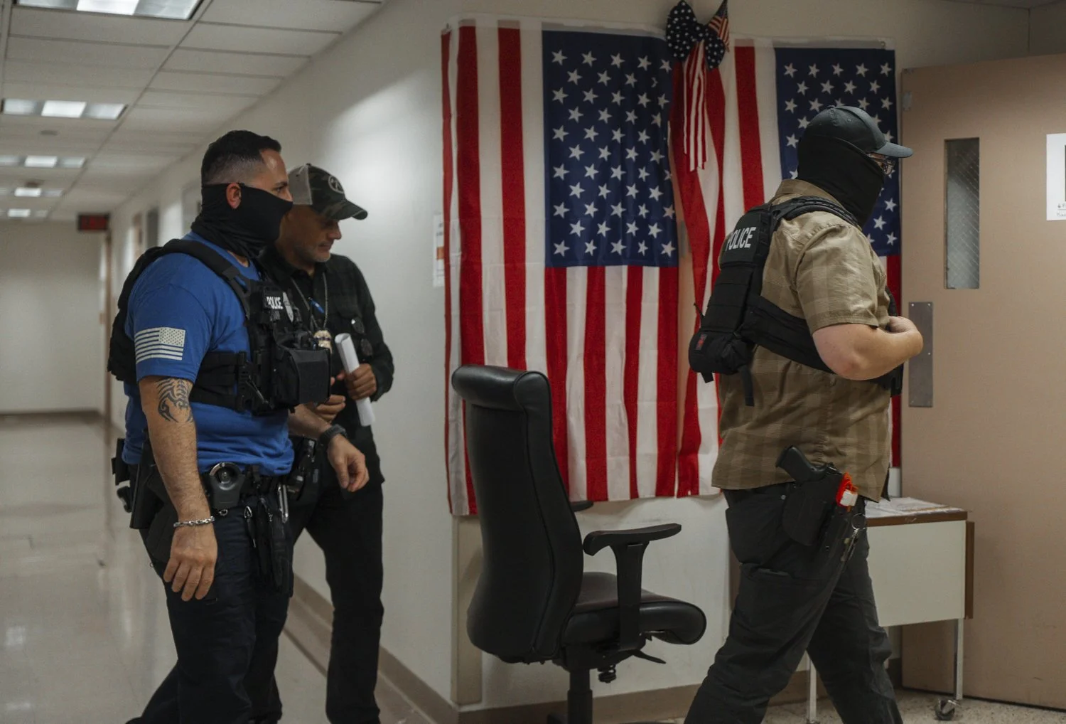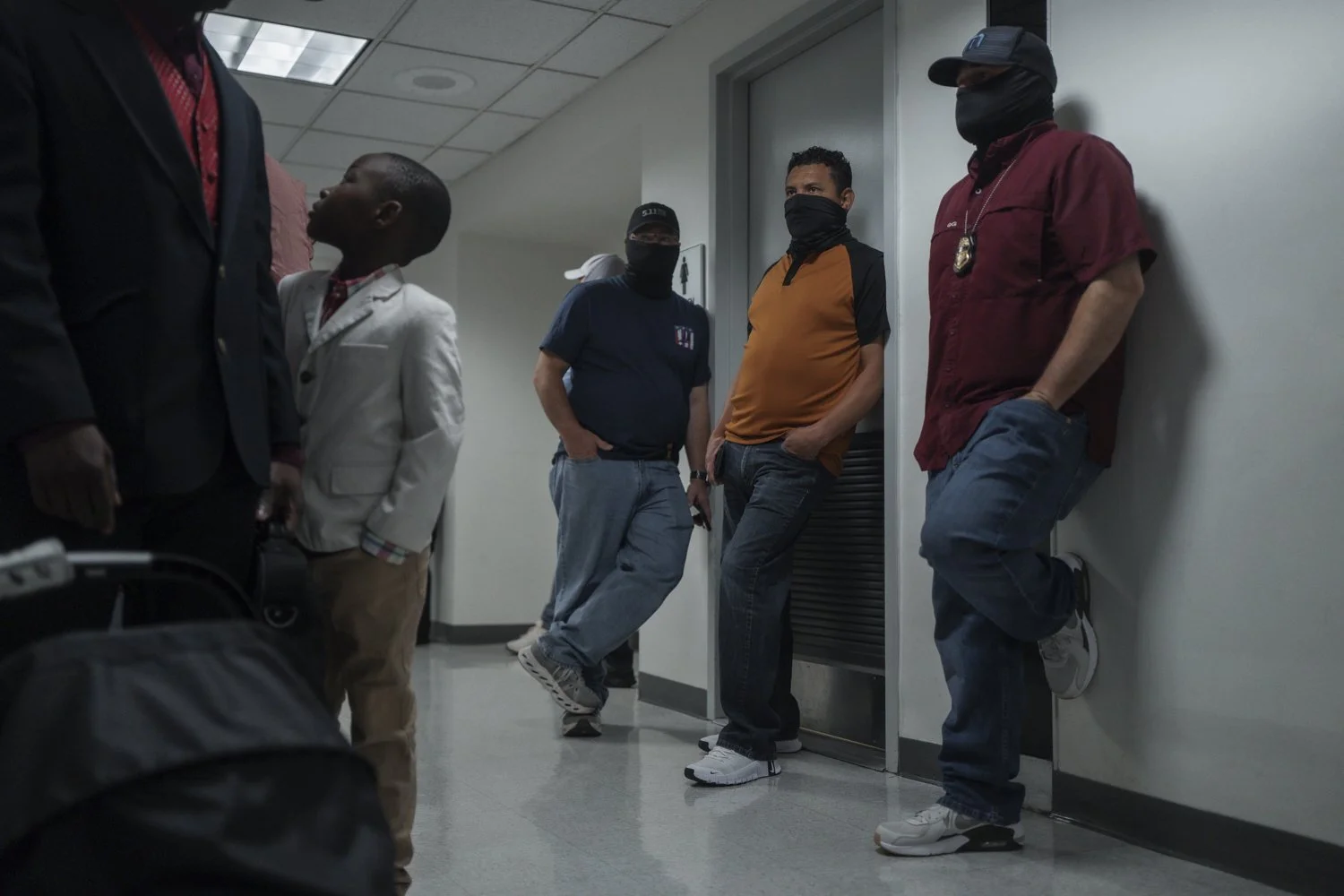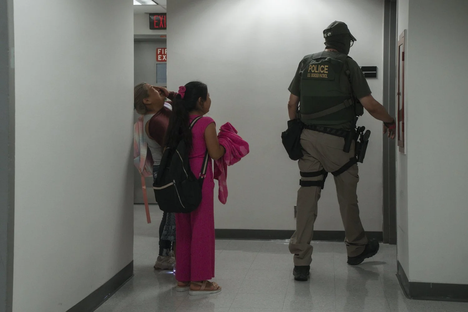 Federal agents watch as a family of asylum seekers from Haiti prepares to enter an immigration courtroom on Tuesday, August 26, 2025, in New York. (AP Photo/Olga Fedorova)