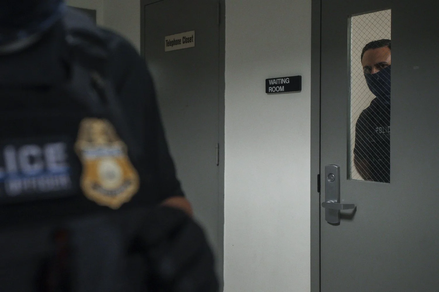 An Immigration and Customs Enforcement agent peers through a door while waiting to detain respondents inside the waiting room of an immigration courtroom on Thursday, July 17, 2025, in New York. (AP Photo/Olga Fedorova)