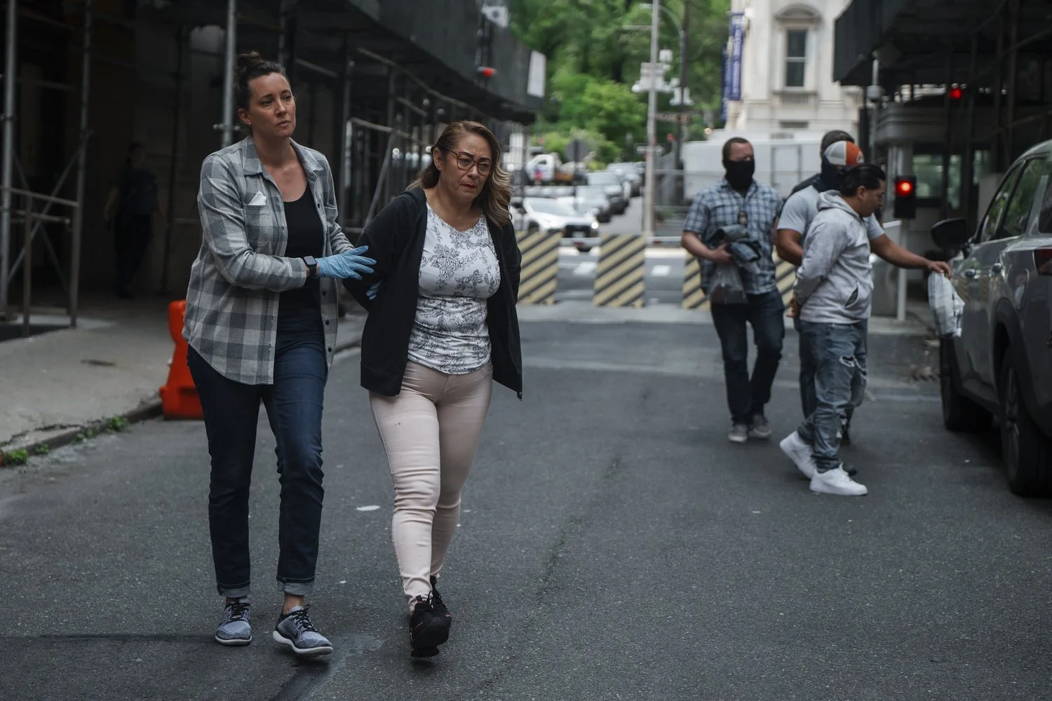 A girl clings to her asylum-seeking father as he is swarmed by agents outside an immigration court in lower Manhattan. Another man, the fear clear on his face, turns back to his wife and daughters as an agent leads him away. Outside courtroom after courtroom, masked immigration agents wait for their next target, leaning against the walls until it’s time for the arrest.