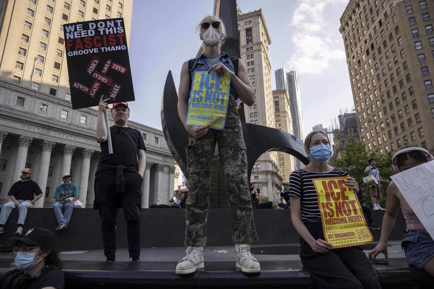 Demonstrators hold signs and chant during a protest against deportations by Immigration and Customs Enforcement in New York, Wednesday, June 11, 2025. (AP Photo/Yuki Iwamura)