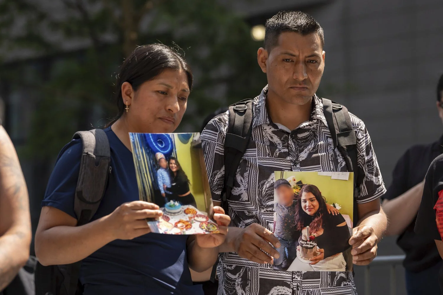 Marco Chipantiza, right, and Maria Chipantiza, left, an Ecuadorian immigrant couple, hold pictures of their daughter Joselyn, 20, an Ecuadorian asylum seeker with 6 years old son, during a press conference outside the Jacob K. Javits federal building on Thursday, July 3, 2025, in New York. (AP Photo/Yuki Iwamura)