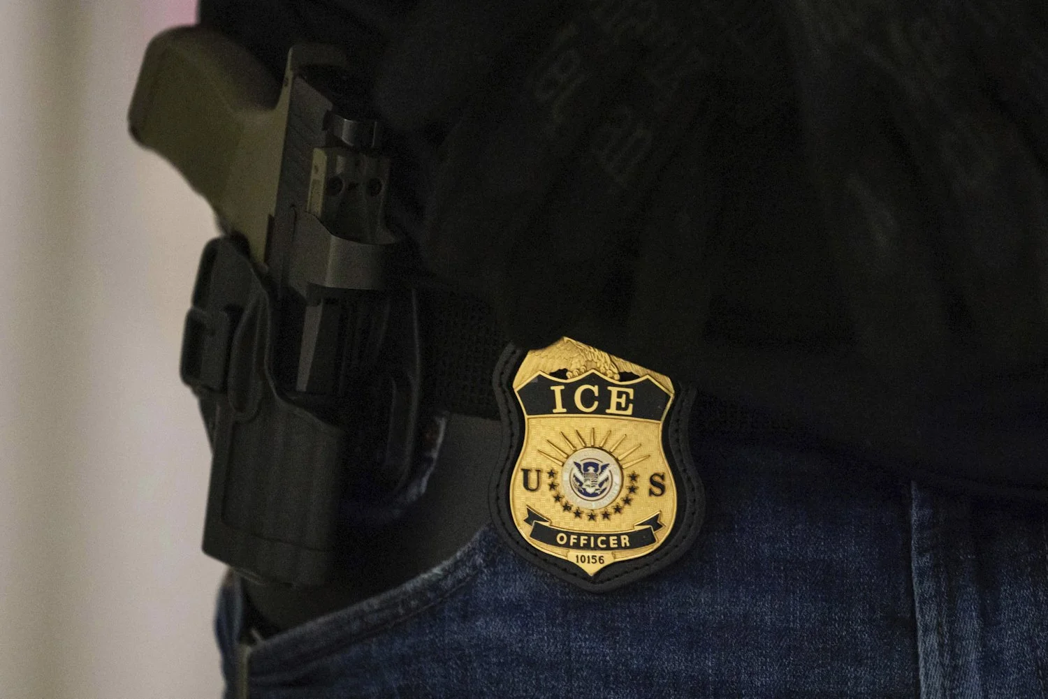 A federal agent wears a badge of Immigration and Customs Enforcement at the immigration court at Jacob K. Javits Federal Building in New York, Monday, June 9, 2025. (AP Photo/Yuki Iwamura)