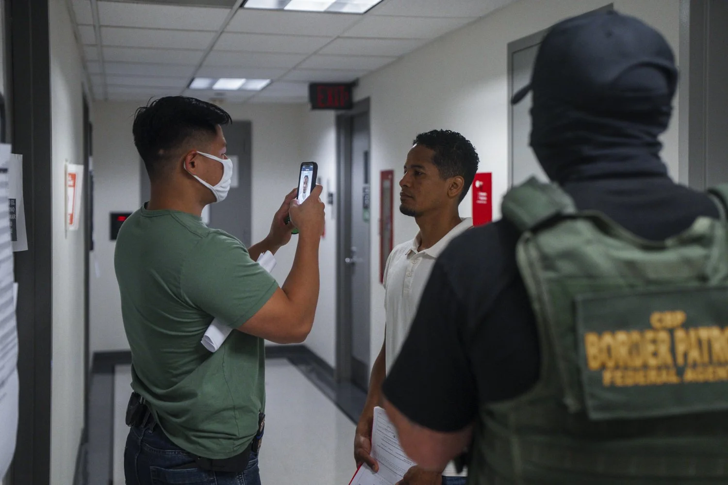 An Immigration and Customs Enforcement (ICE) agent uses facial recognition software to confirm an asylum seeker's identity prior to an immigration hearing on Wednesday, July 30, 2025, in New York. (AP Photo/Olga Fedorova)