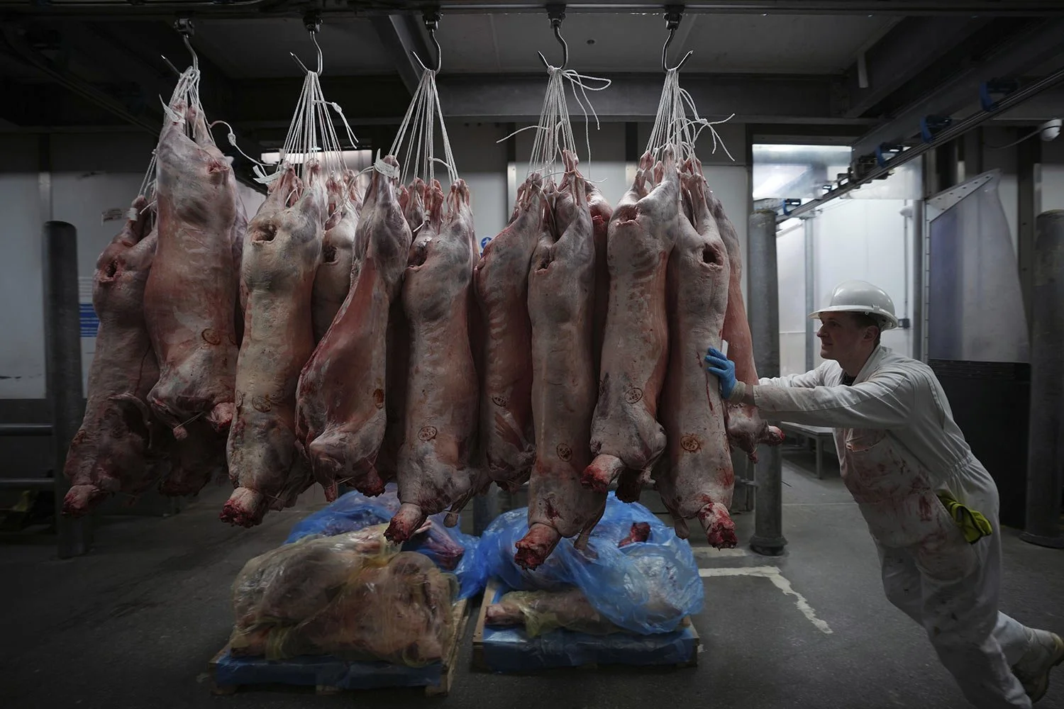 A worker pushes newly-delivered pork inside Smithfield Market in London, early morning Friday, Jan. 10, 2025. (AP Photo/Kin Cheung)