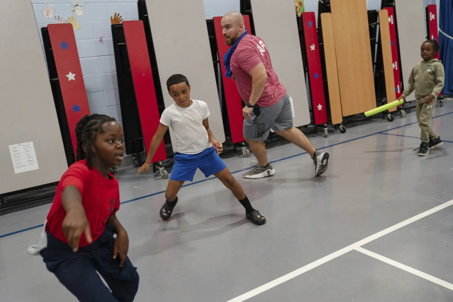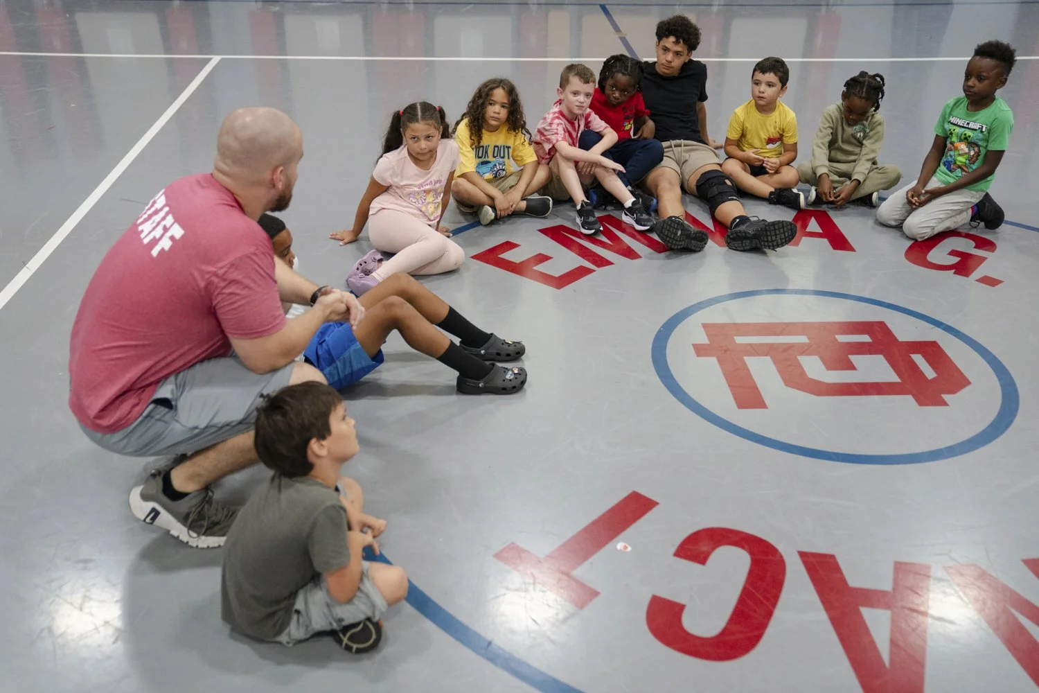Thomas Boucher leads children in an activity during the East Providence Boys and Girls Club Summer Camp at Emma G. Whiteknact Elementary School on Thursday, July 10, 2025, in Providence R.I. (AP Photo/Sophie Park)