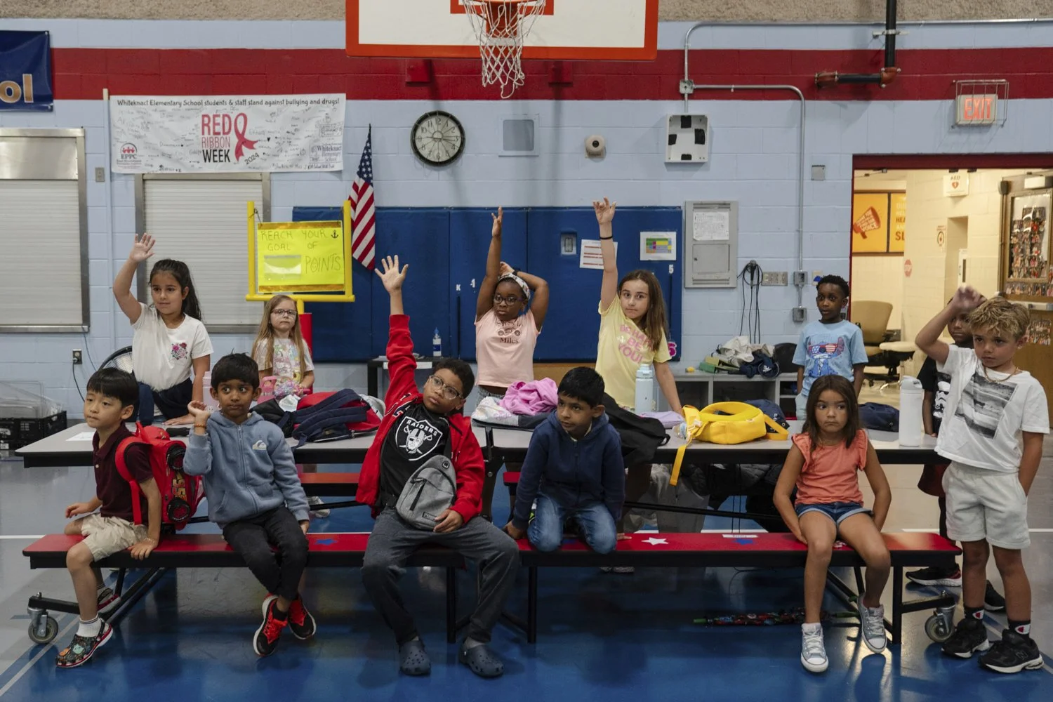 Children raise their hands while participating in activities during the East Providence Boys and Girls Club Summer Camp at Emma G. Whiteknact Elementary School on Thursday, July 10, 2025, in Providence R.I. (AP Photo/Sophie Park)