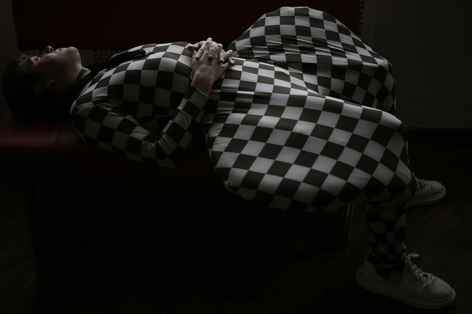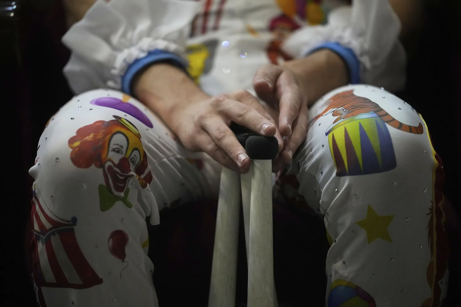 A circus performer rests prior to Karandash-Fest, a street festival of circus performers in Staritsa, Tver region, Russia, Saturday, Aug. 2, 2025. (AP Photo/Pavel Bednyakov)