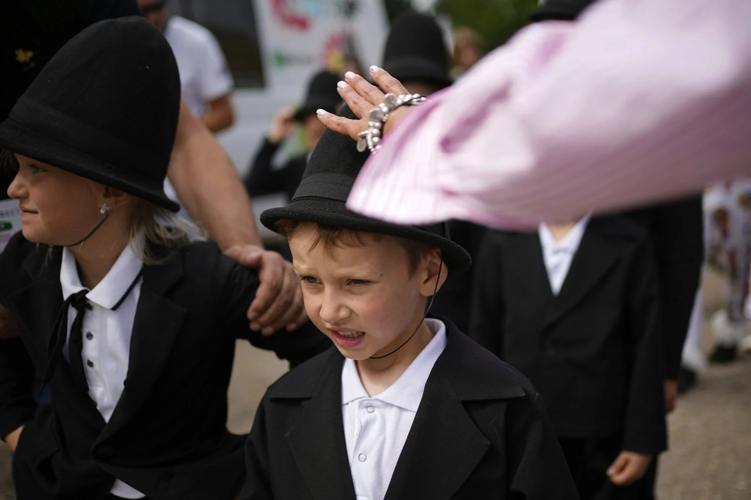 Young actors prepare for Karandash-Fest, a street festival of circus performers in Staritsa, Tver region, Russia, Saturday, Aug. 2, 2025. (AP Photo/Pavel Bednyakov)