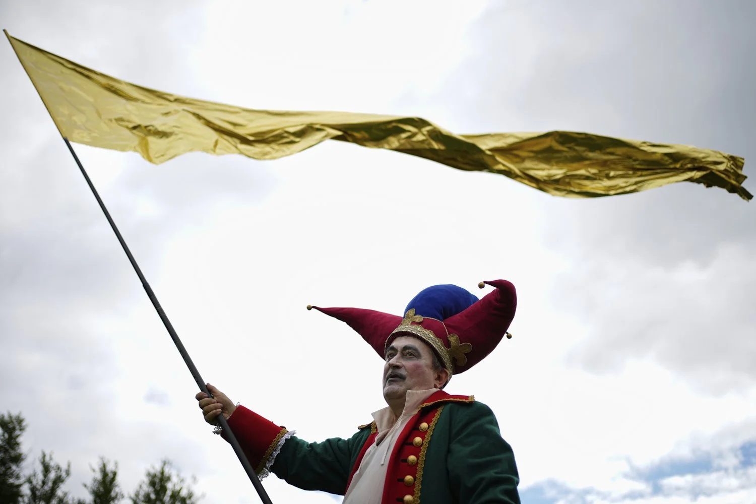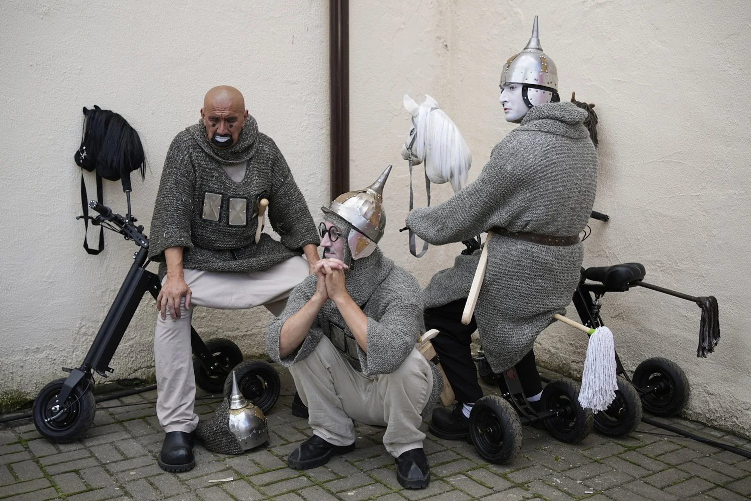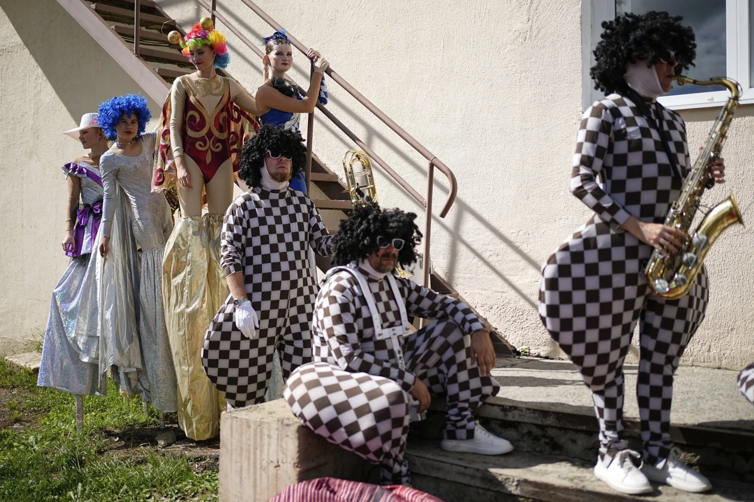 Circus performers wait for the start of the Karandash-Fest, a street festival of circus performers, in Staritsa, Tver region, Russia, Saturday, Aug. 2, 2025. (AP Photo/Pavel Bednyakov)