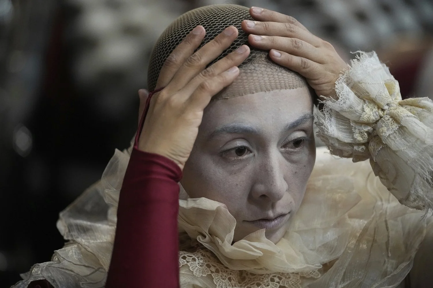 Circus performers warm up at the backstage of Karandash-Fest, a street festival of circus performers in Staritsa, Tver region, Russia, Saturday, Aug. 2, 2025. (AP Photo/Pavel Bednyakov)