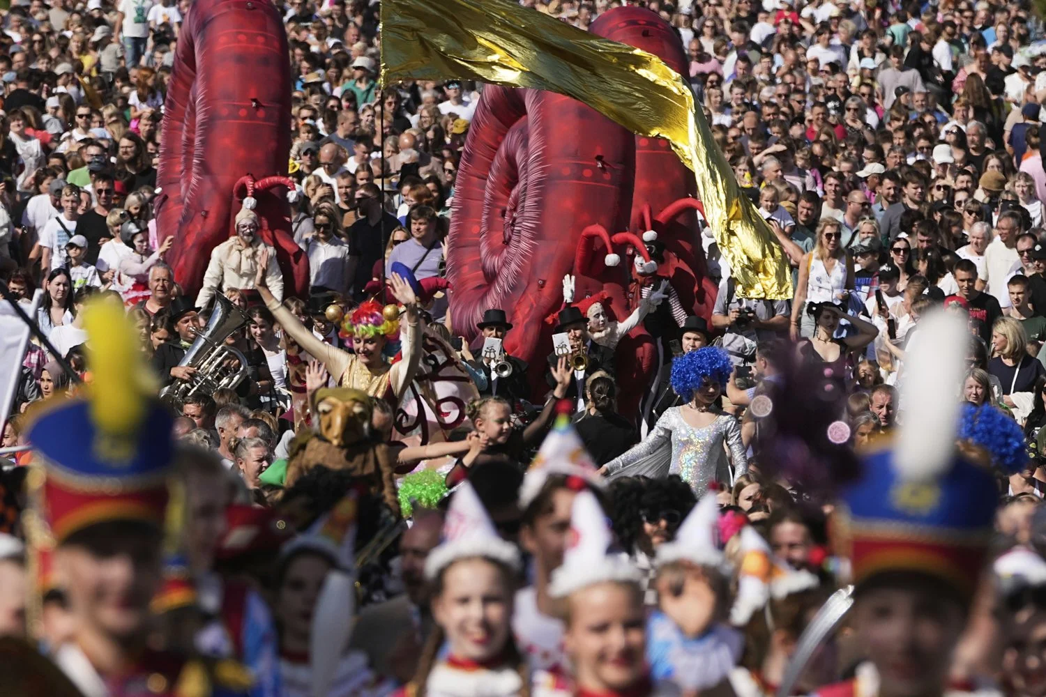 Spectators attend Karandash-Fest, a street festival of circus performers in Staritsa, Tver region, Russia, Saturday, Aug. 2, 2025. (AP Photo/Pavel Bednyakov)