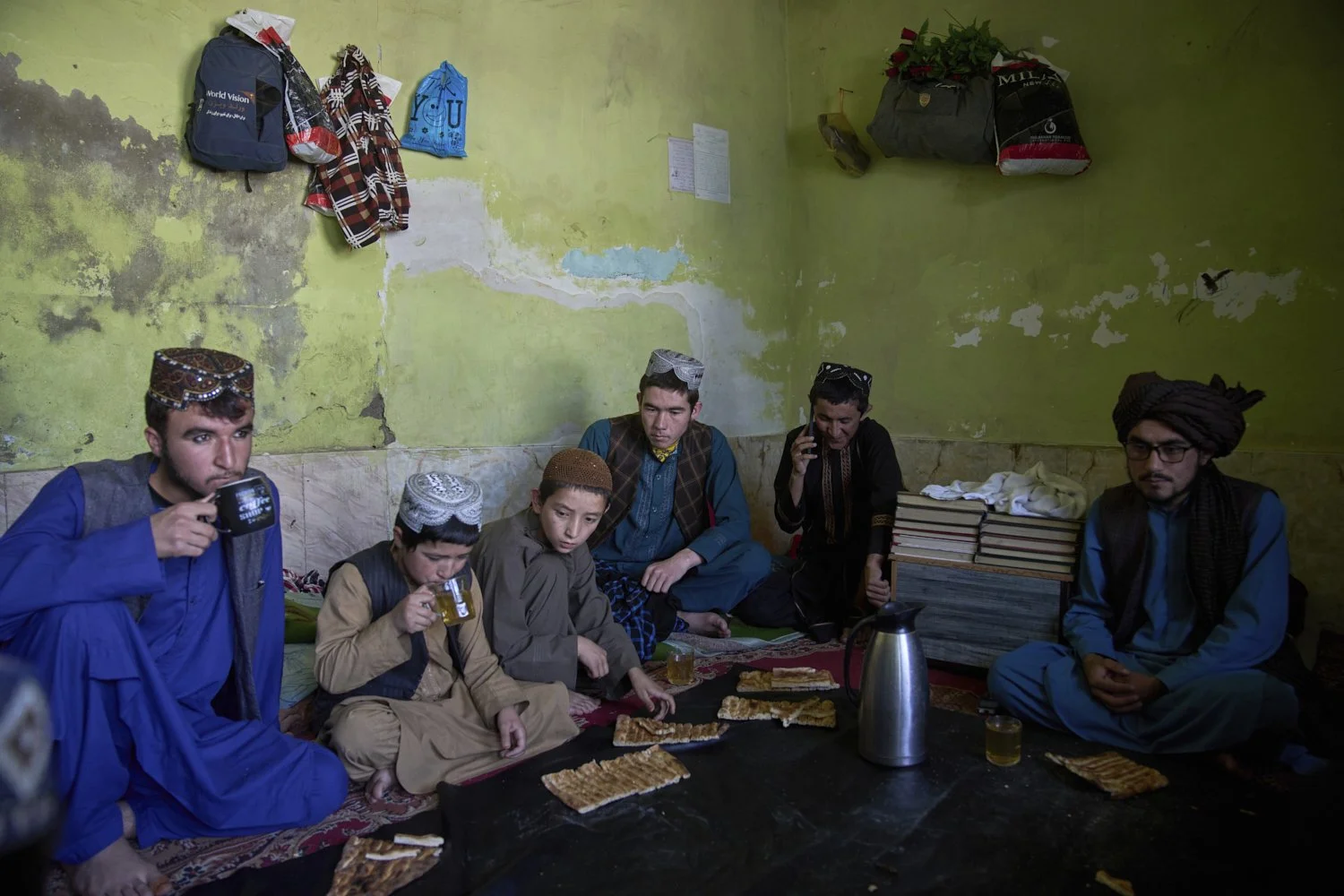 Afghan boys living at the Imam al-Tirmidhi religious school eat bread and drink tea for breakfast in Kabul, Afghanistan, Wednesday, June 11, 2025. (AP Photo/Ebrahim Noroozi)