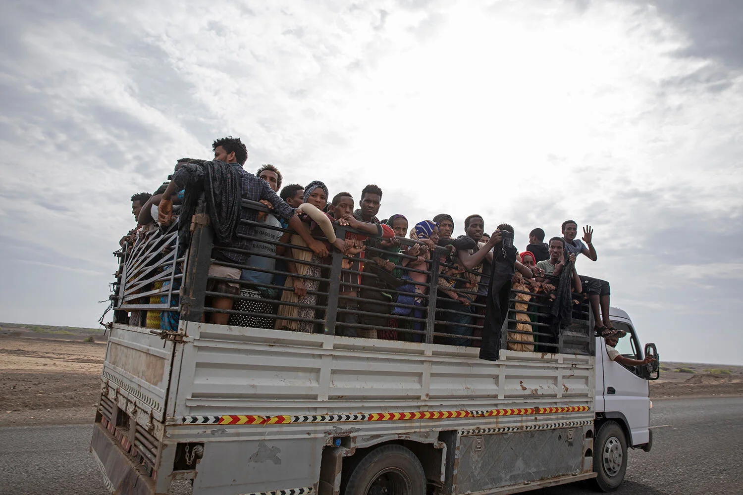 Ethiopian migrants who had just arrived in Yemen from Djibouti stand in the back of a pickup truck to be taken to desert compounds known in Arabic as "hosh," in Ras al-Ara, Lahj, Yemen. (AP Photo/Nariman El-Mofty)