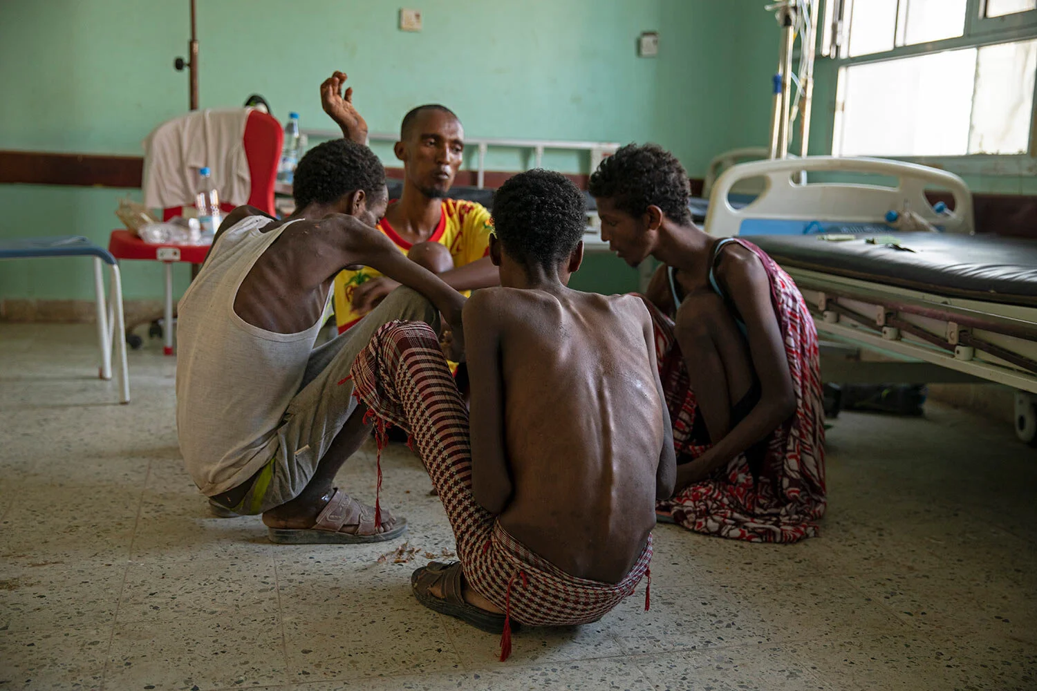 At Ras al-Ara hospital, four men who looked like living skeletons sat on the floor, picking rice from a bowl with their thin fingers. Their bones protruded from their backs, their rib cages stood out sharply. With no fat on their bodies, they sat on rolled-up cloth because it was too painful to sit directly on bone. They had been imprisoned by traffickers for months, fed once a day with scraps of bread and a sip of water, they said.