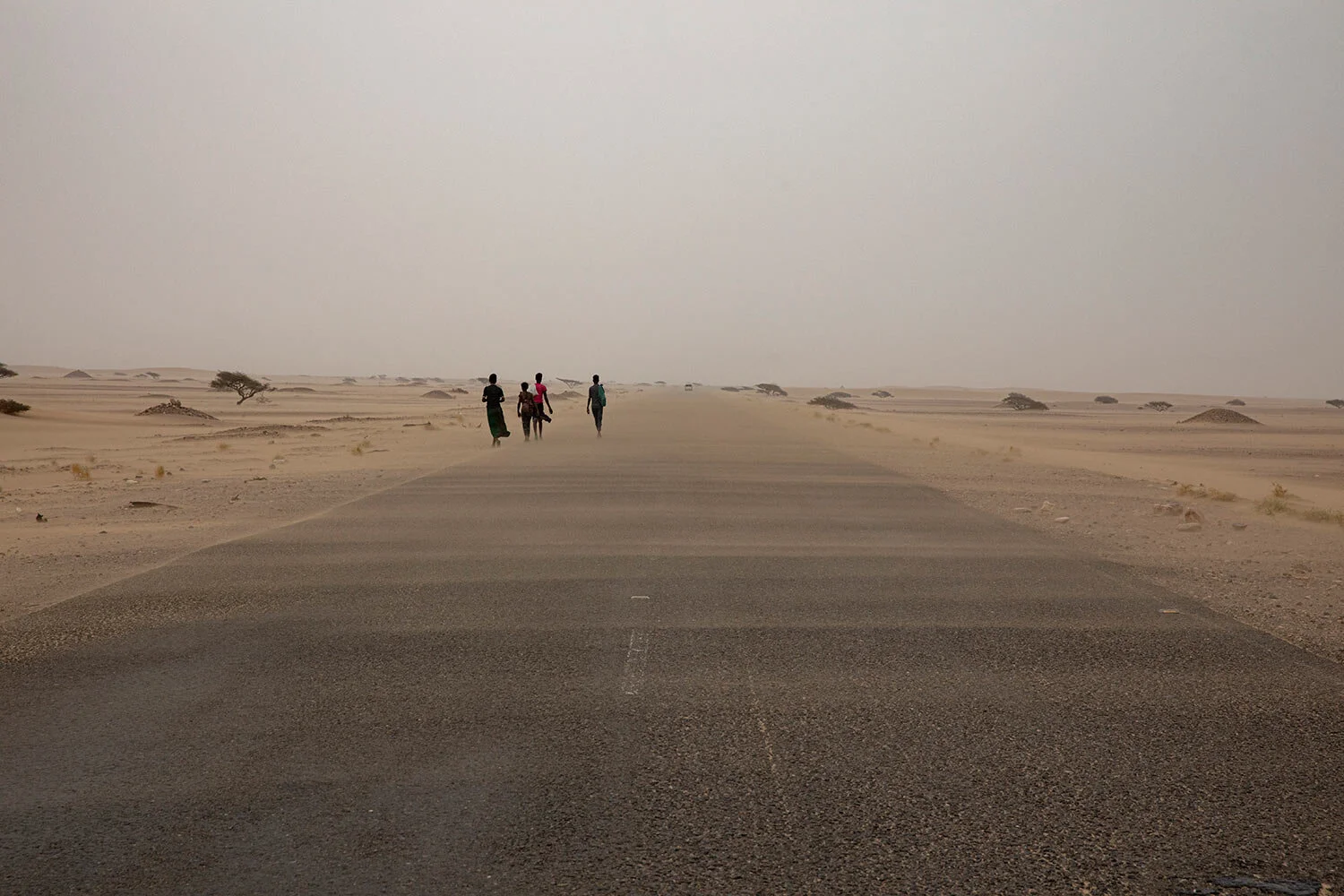 Ethiopian migrants walk along a road in a sandstorm in Lahj, Yemen. (AP Photo/Nariman El-Mofty)
