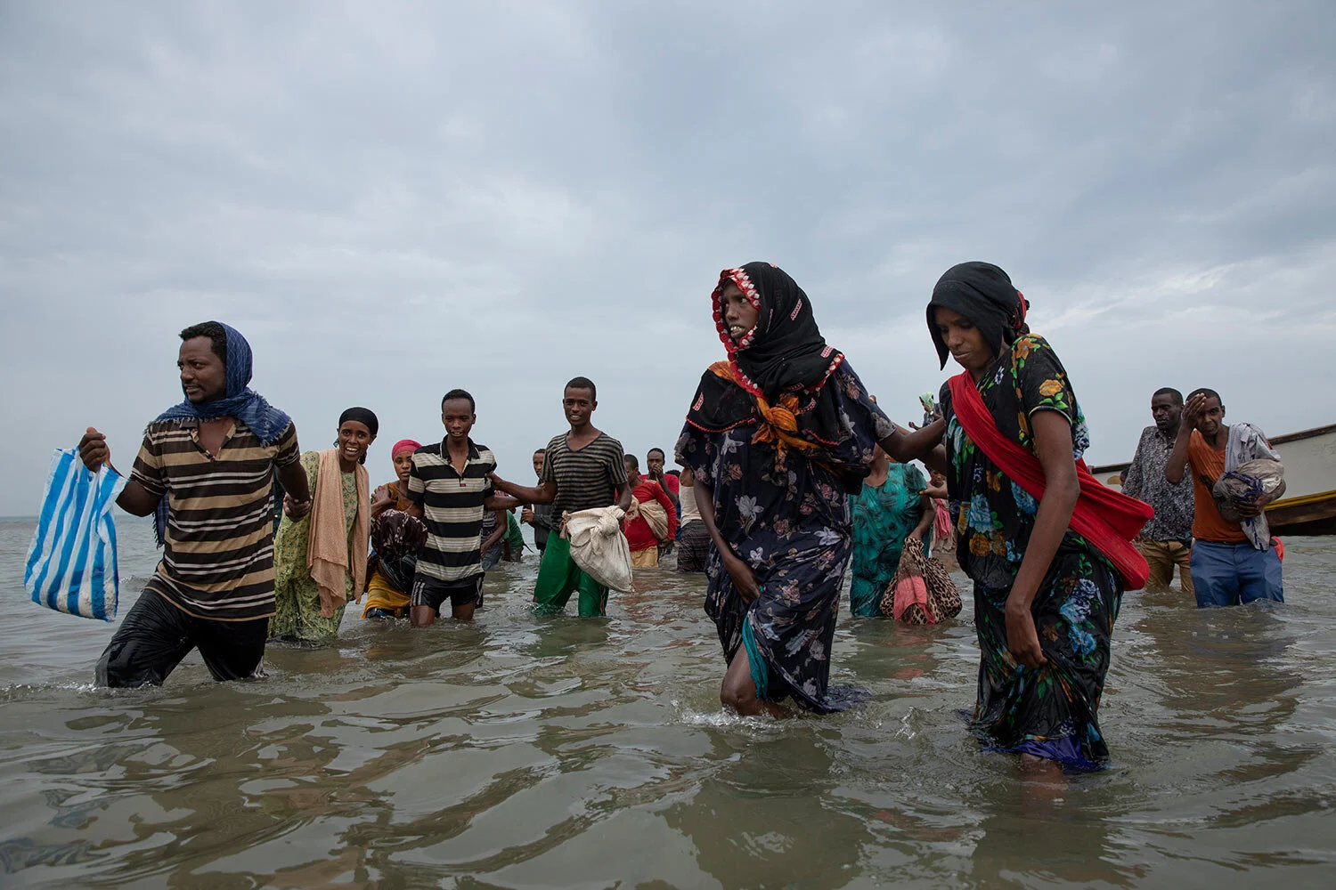 Hundreds of men, women and teenagers clambered out of a boat and through the surf emerging, exhausted, on the shores of Yemen.