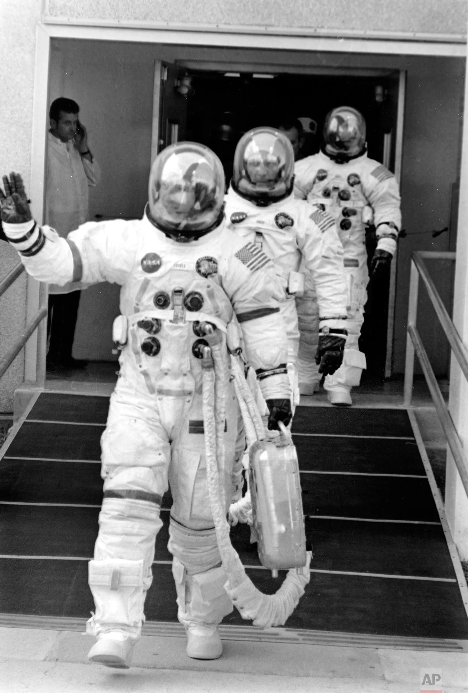 A water level view of the Apollo 13 recovery operations in the South Pacific Ocean, April 17, 1970. The three astronauts are seen leaving their spacecraft. John L. Swigert Jr. (back to camera), command module pilot, is already in the life raft. Fred W. Haise Jr., lunar module pilot, facing camera, is stepping into the life raft. James A. Lovell Jr., commander, is leaving the spacecraft in the background. (AP Photo/NASA)