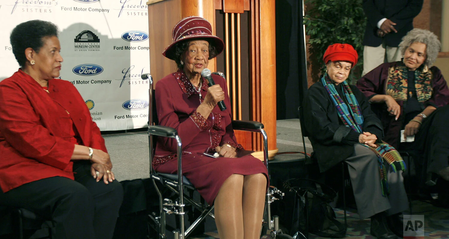 Ella Baker, seated next to actress Ruby Dee, speaks on Jan. 3, 1968, the 25th anniversary of suffragist Jeanette Rankin’s last day in office as a member of the House from Montana. Rankin was the first woman to hold federal office in the United States. At the time this picture was made, Baker was serving as a consultant to the Southern Conference Educational Fund, raising money to support the workers of SNCC. (Student Non-Violent Coordinating Committee), which she founded in April 1960. (AP Photo/Jack Harris)