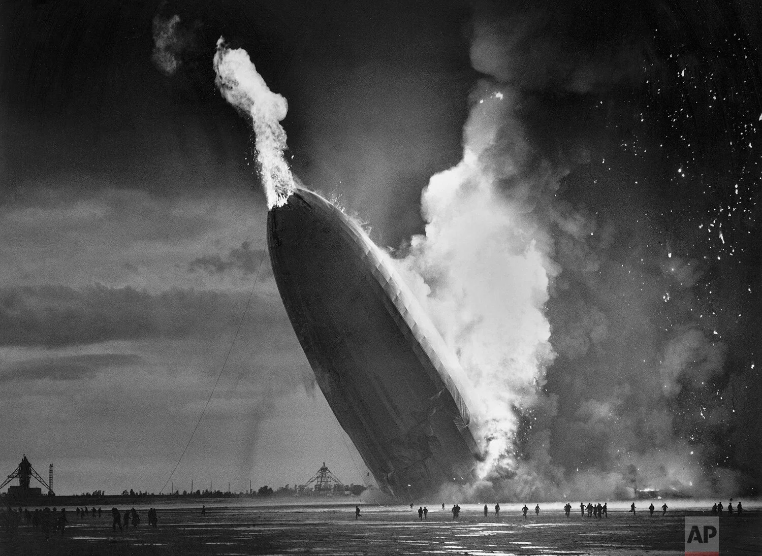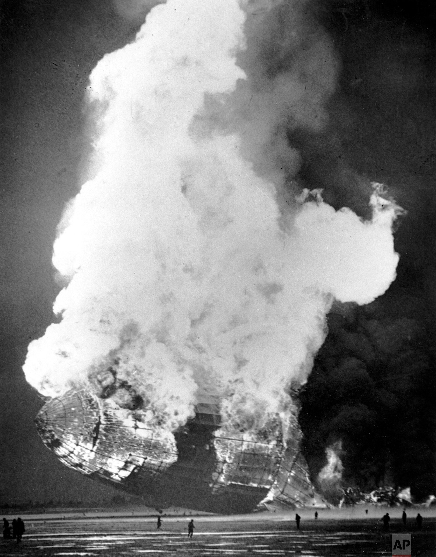 The Hindenburg zeppelin hits the ground after an explosion in mid-air destroyed the hydrogen-inflated German airship over Lakehurst, N.J., on May 6, 1937. The crew was preparing to land at the U.S. Naval base station when the explosion occured. Thirty six of the 97 persons on board were killed. (AP Photo/Murray Becker)