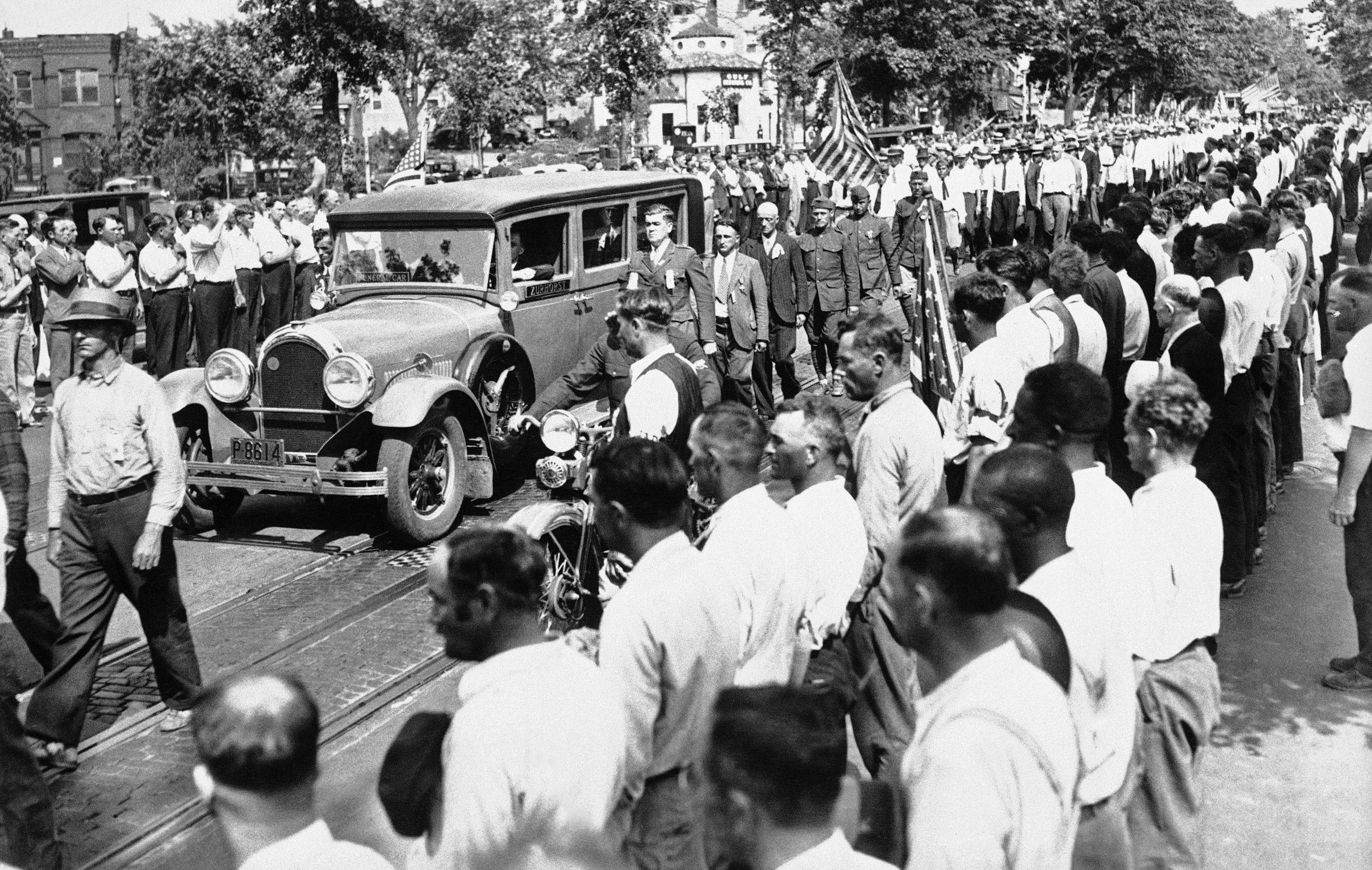 For more than two months in the summer of 1932, World War I veterans from all over the country converged on Washington, D.C., to demand passage of a bill which would provide early payment of bonuses. Here, vets standing in silence as body of one of their champions, Rep. Edward Eslick of Tennessee, is borne past. Eslick died of a heart attack on June 14, 1932 while delivering a speech in favor of the bill in the House of Representatives. (AP Photo)
