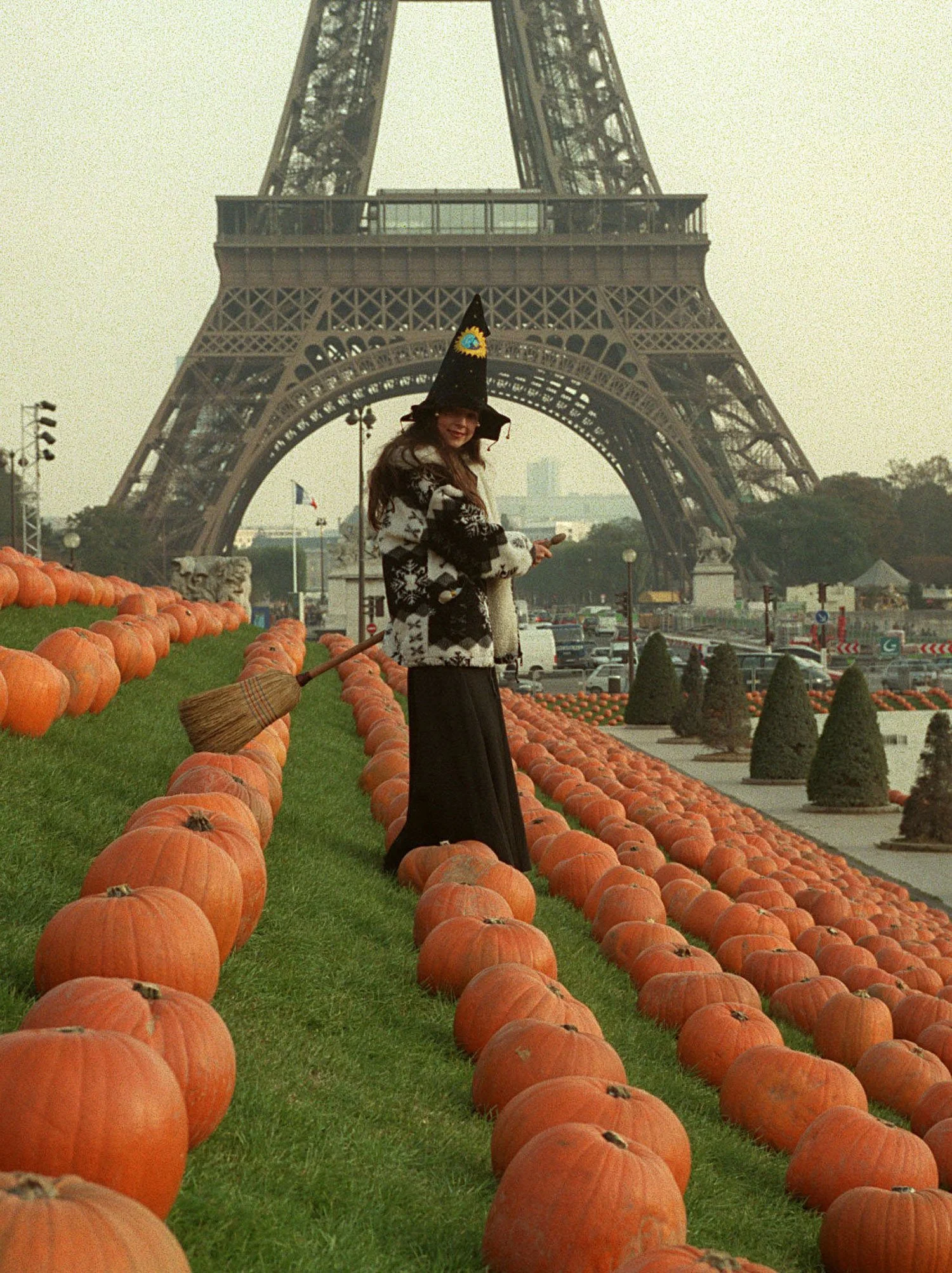 Sylvie Thecier, 12, dressed as a witch, stands in the middle of a pumpkin arrangement in the gardens of the Trocadero, Paris, Friday, Oct. 31, 1997. The 8,000 pumpkins line the Trocadero esplanade near the Eiffel Tower, seen in background, - the latest sign that the traditionally American Halloween fete is catching on in France. (AP Photo/Francois Mori)