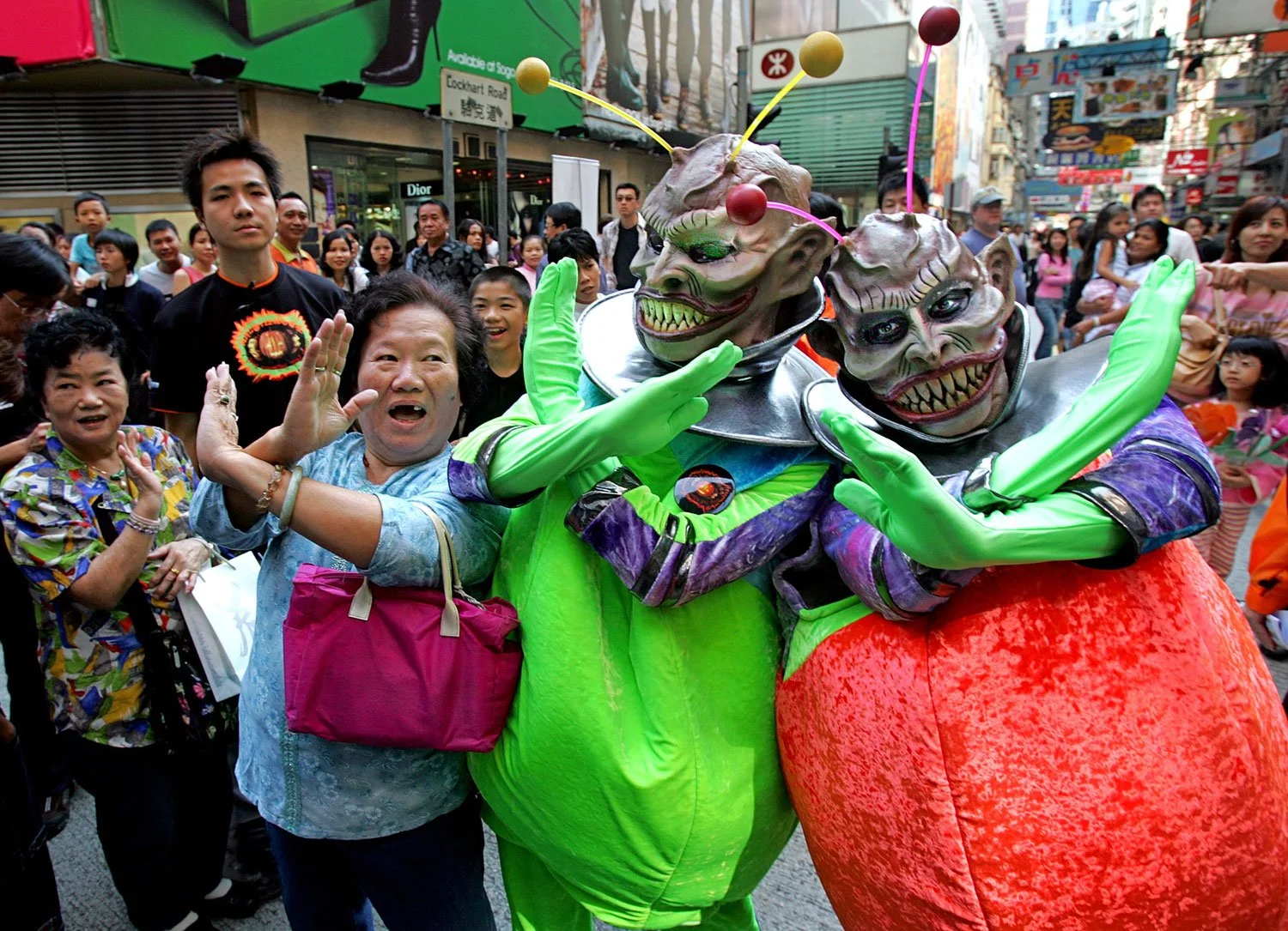 Two people dressed up as aliens entertain the crowd at a Hong Kong downtown street, Sunday, Oct. 3, 2004, as part of this month's Halloween activities. (AP Photo/Vincent Yu)