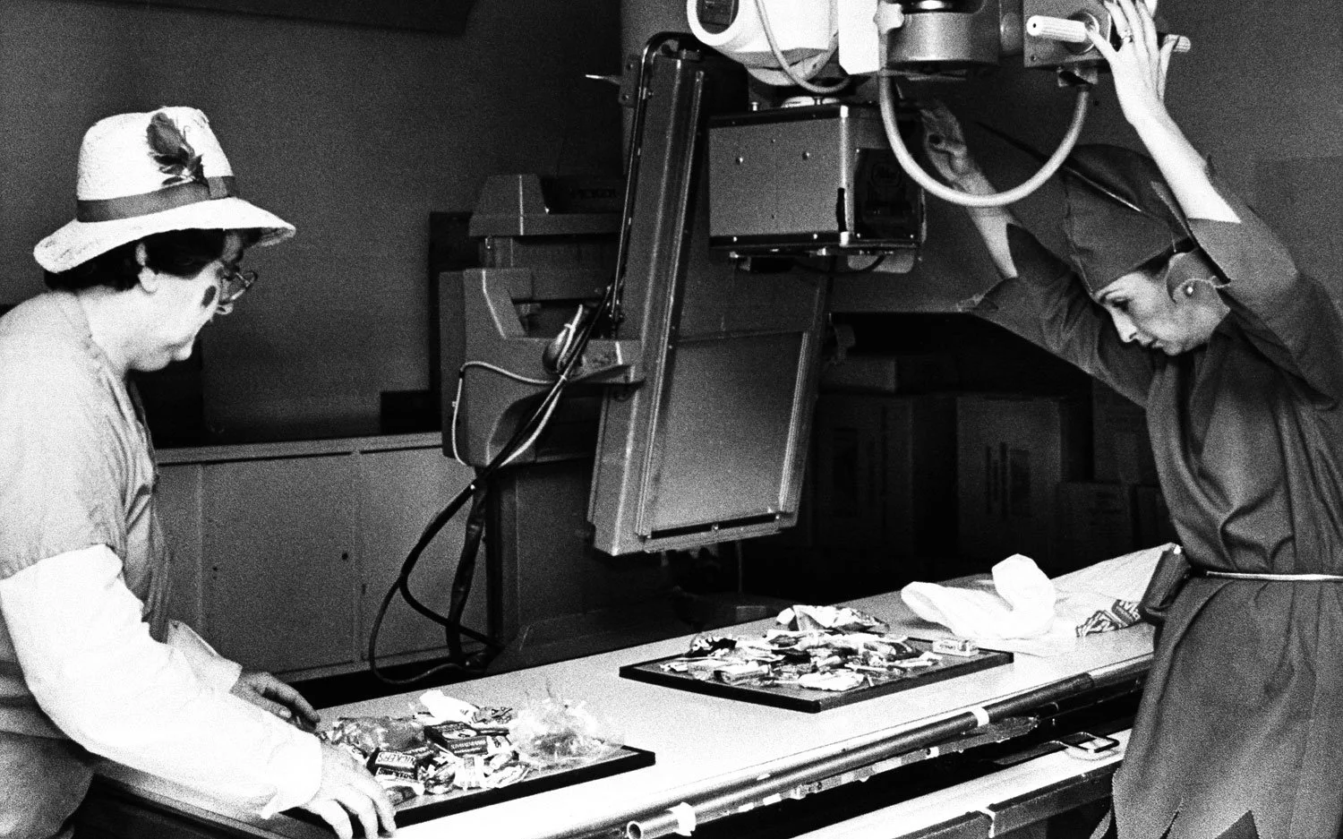 Rita Brennan, left, and Sharon DeCoste X-ray candy brought in by trick or treaters to the Jordan Hospital in Plymouth, Mass., Oct. 1, 1982. The hospital offered free X-rays of Halloween candy to area residents concerned about the safety of the candy. (AP Photo)