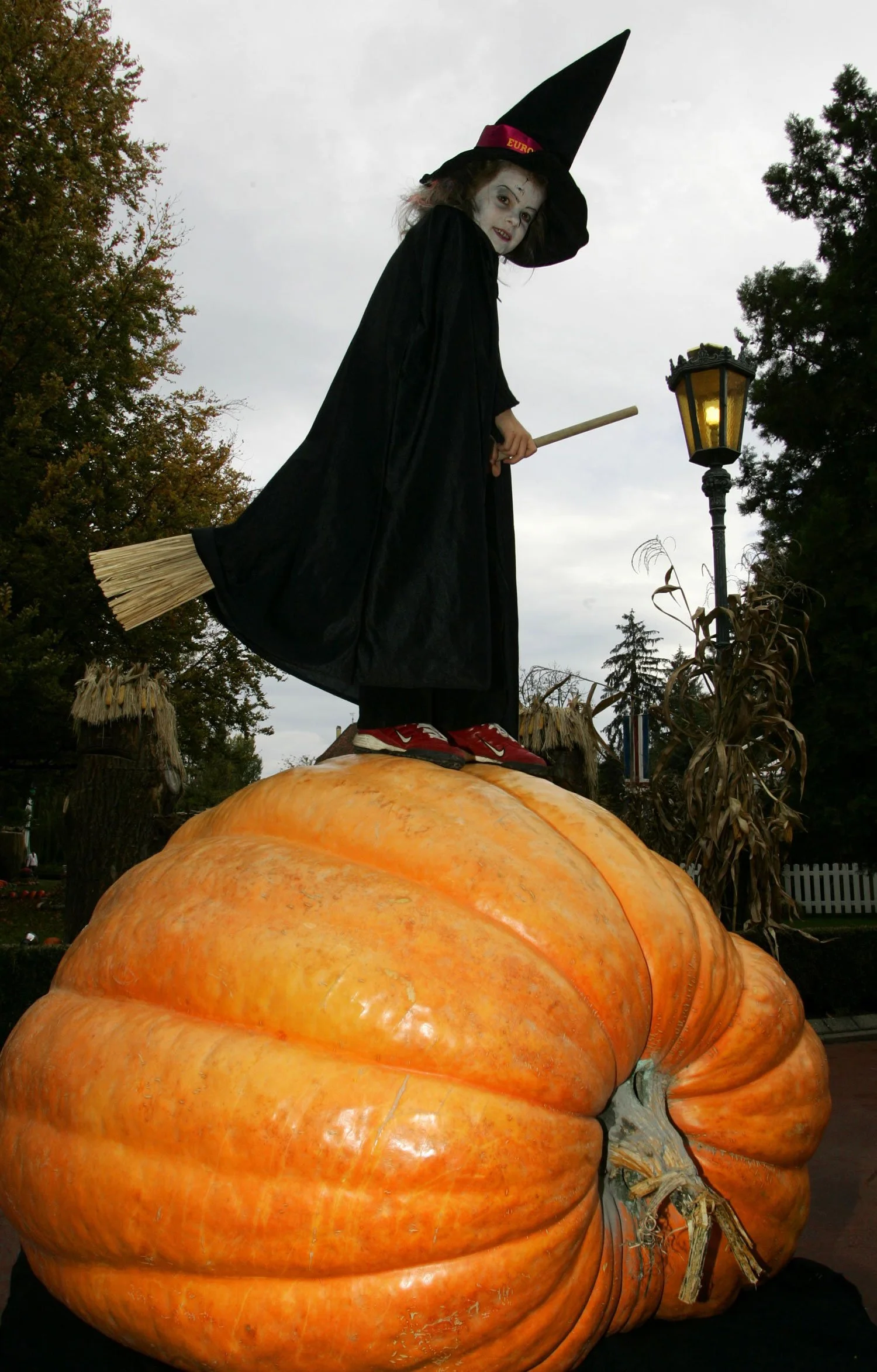 Seven year old Anna poses as a witch with a giant pumpkin at the leisure park Europa-park in Rust, southern Germany, on Friday, Oct. 21, 2005, during a Halloween celebration. The pumpkin weighs 418.8 kg and has a radius of 4.23 meters. It is said to be one of the biggest pumpkins ever measured in Europe. (AP Photo/Winfried Rothermel)