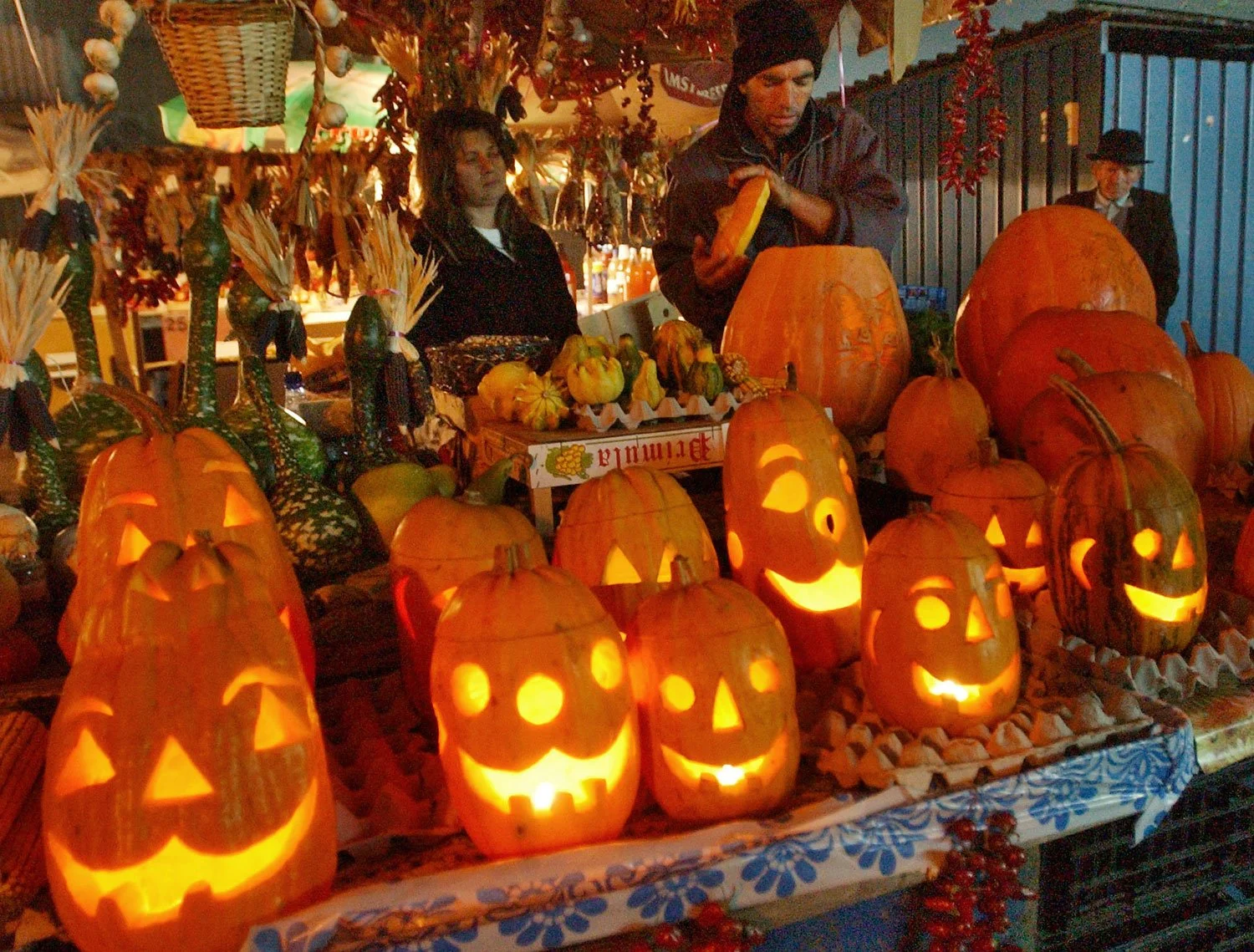 A Romanian farmer waits for customers for his Halloween pumpkins in a Bucharest, Romania market Saturday night, Oct. 30, 2004. Celebrating Halloween started after the 1989 fall of the communist rule in Romania and is increasingly popular among young people. (AP Photo/Vadim Ghirda)